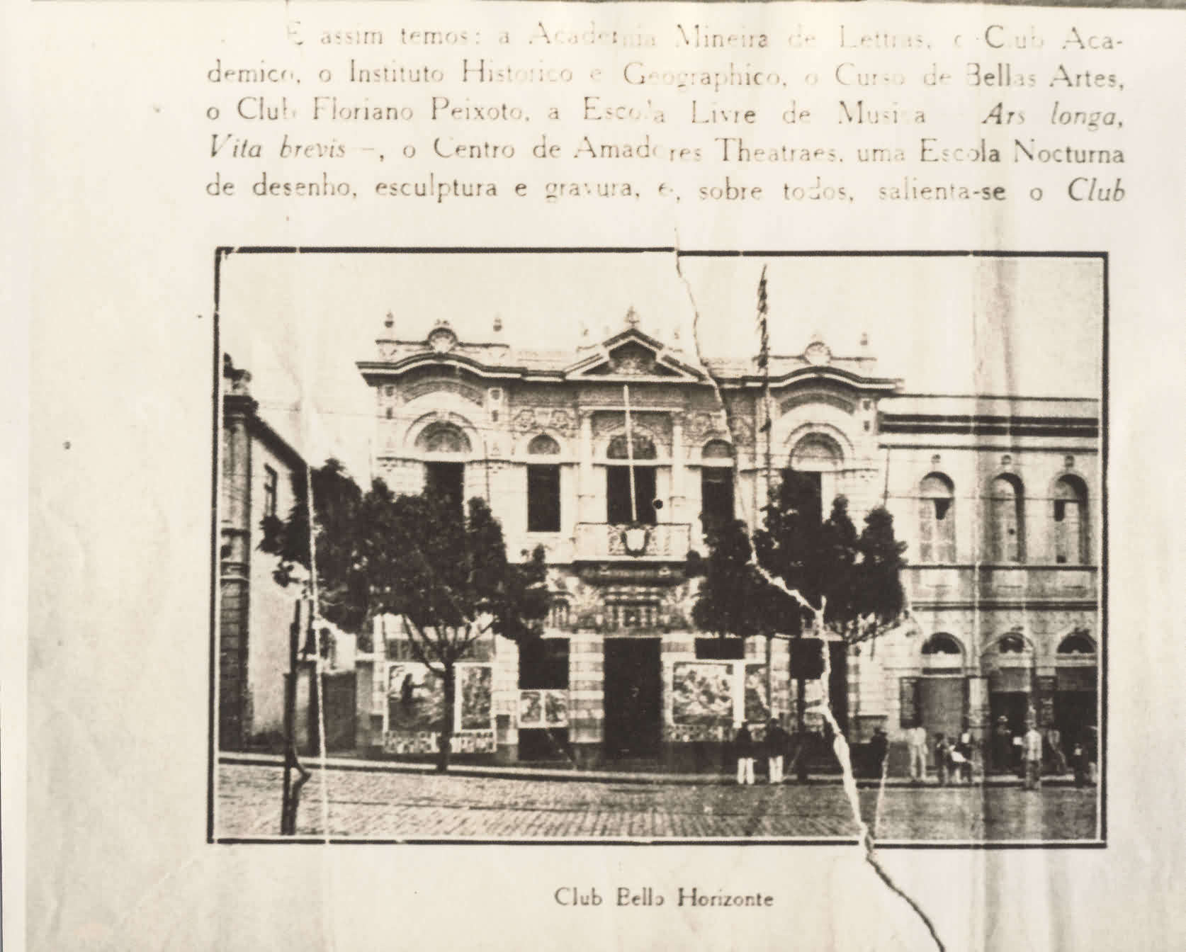 ANOTAES: "E ASSIM TEMOS: A ACADEMIA MINEIRA DE LETRAS, O CLUB ACADEMICO, O INSTITUTO HISTORICO E GEOGRAPHICO, O CURSO DE BELLAS ARTES, O CLUB FLORIANO PEIXOTO, A ESCOLA LIVRE DE MUSICA ARS LONGA, VITA BREVIS, O CENTRO DE AMADORES THEATRAES, UMA ESCOLA NOCTURNA DE DESENHO, ESCULPTURA E GRAVURA, E, SOBRE TODOS, SALIENTA-SE O CLUB BELLO HORIZONTE QUE PREFERIDO PELO [ILEGVEL]." |