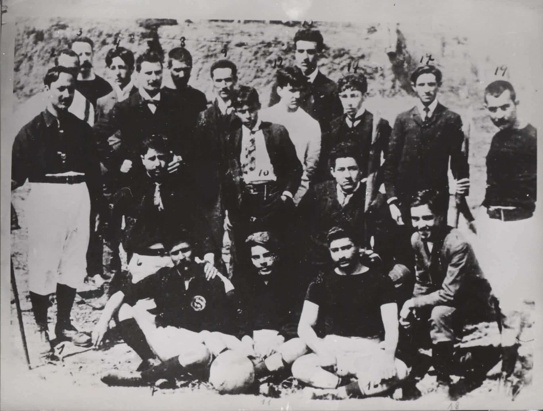ANOTAES: "IDENTIFICADOS DA ESQUERDA PARA A DIREITA: 1-JORDO CAIRES; 2-[?]; 3-AUGUSTO PEREIRA SERPA; 4-VIRGLIO FABIANO ALVES; 5-DR. OSCAR AMERICANO MINEIRO DA CAPONHA; 6-JOS GONALVES; 7-AVELINO RODRIGUES; 8- ANTNIO NUNES DE ALMEIDA; 9-FRANCISCO DE ASSIS DAS CHAGAS RESENDE; 10-ABEL HORTA DRUMOND; 11-VITOR SERPA; 12- VIRIATO MASCARENHAS; 13-TOM ANDRADE; 14- JOAQUIM BRASIL; 15-JOAQUIM ROQUE TEIXEIRA; 16-MIGUEL LILBMAN; 17-JOS MARIANO DE SALES; 18-[?]; 19-ANTNIO MASCARENHAS." |