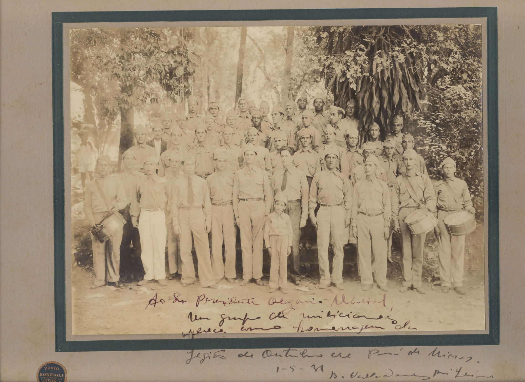 ANOTAES: "AO SR. PRESIDENTE OLEGRIO MACIEL. UM GRUPO DE MILICIANOS OFFERECE COMO HOMENAGEM DA LEGIO DE OUTUBRO DE PAR DE MINAS. 1 - 5 - 31." "PHOTO BONFIOLI. BELLO HORIZONTE" |