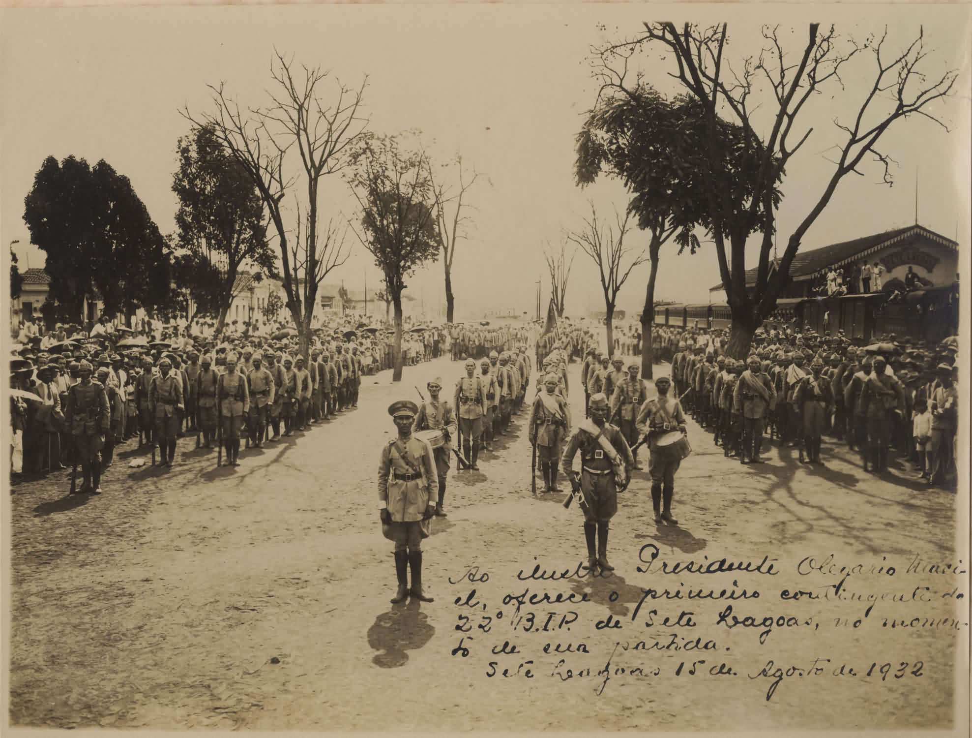 ANOTAES: "AO ILUSTRE PRESIDENTE OLEGRIO MACIEL, OFERECE O PRIMEIRO CONTINGENTE DO 22 BIP. DE SETE LAGOAS, NO MOMENO DE SUA PARTIDA. SETE LAGOAS 15 DE AGOSTO DE 1932." |