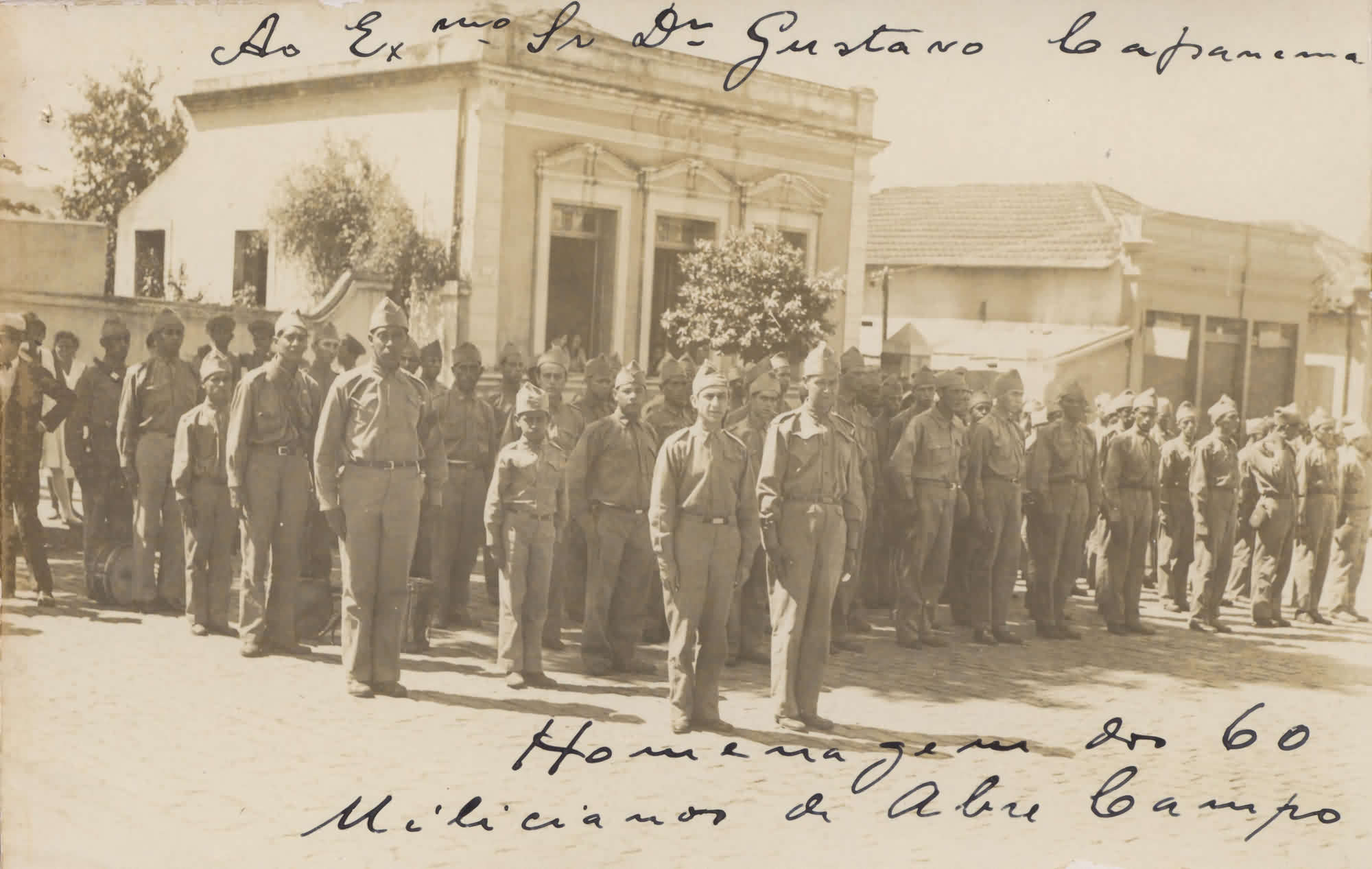 ANOTAES: "AO EXM SR DR GUSTAVO CAPANEMA HOMENAGEM AOS 60 MILICIANOS DE ABRE CAMPO"-"DELEGADO E PRESIDENTE DA LEGIO: DR. TRAJANO DE MELLO MORAIS. SECRETRIO GERAL: DR. CUSTODIO DE PAULA RODRIGUES" |