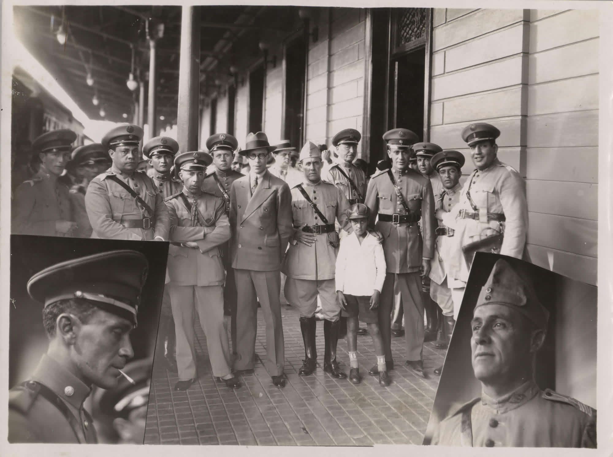 MONTAGEM DE FOTOS: GUSTAVO CAPANEMA E GRUPO DE MILITARES NA ESTAO FERROVIRIA; NOS DETALHES: TEN.CEL. VARGAS E TEN.CEL. ANSIO FRES