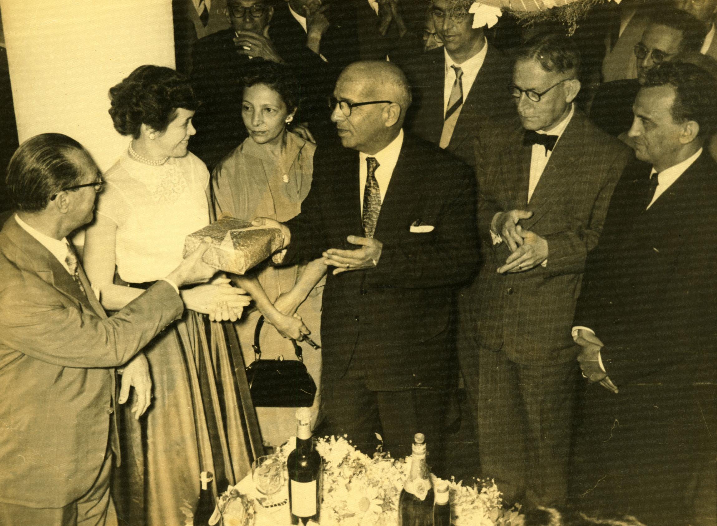 | Descrio:: | PESSOAS REUNIDAS EM CONFRATERNIZAO DA REDE MINEIRA DE VIAO: ESQUERDA OS ENGENHEIROS FRANCISCO SANCHES E ARISTILIO CCERO DE CARVALHO SEGURAM UM EMBRULHO; DIREITA, OS ENGENHEIROS ARMANDO GOUVEIA E DERMEVAL JOS PIMENTA; AO FUNDO, OS ENGENHEIROS ROBERTO CARNEIRO E JOS DE CASTRO. |