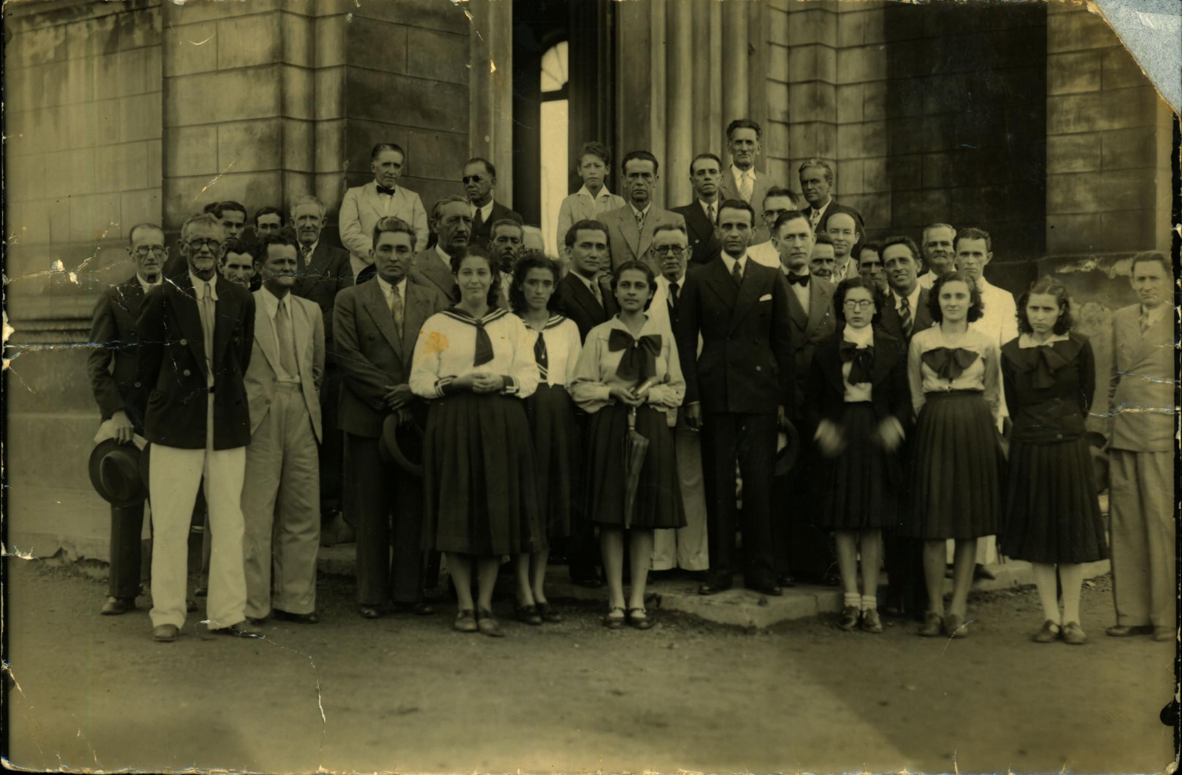 DERMEVAL JOS PIMENTA, FRENTE, DE TERNO ESCURO E LENO NO BOLSO, E O ENGENHEIRO ARMANDO GOUVEIA, SUA ESQUERDA DURANTE VISITA A DORES DO INDAI.