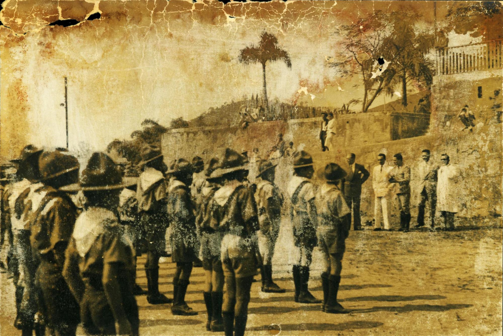| Descrio:: | DERMEVAL JOS PIMENTA, SEGUNDO DA ESQUERDA PARA A DIREITA, DE TERNO CLARO OBSERVANDO ESCOTEIROS EM FORMAO. |