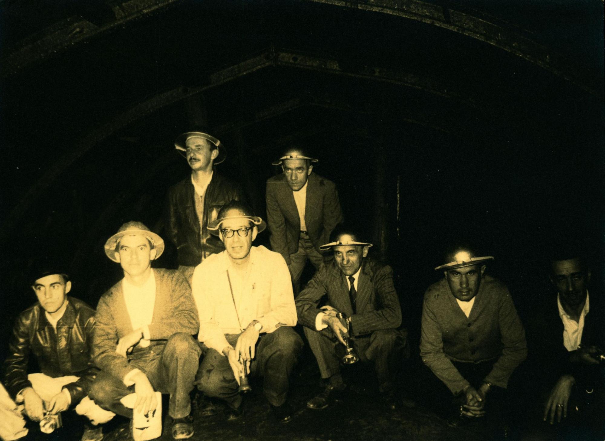 | Descrio:: | DERMEVAL JOS PIMENTA, DE TERNO LISTRADO SEGURANDO UMA LANTERNA, E COMITIVA EM VISITA DE INSPEO A UMA MINA. |