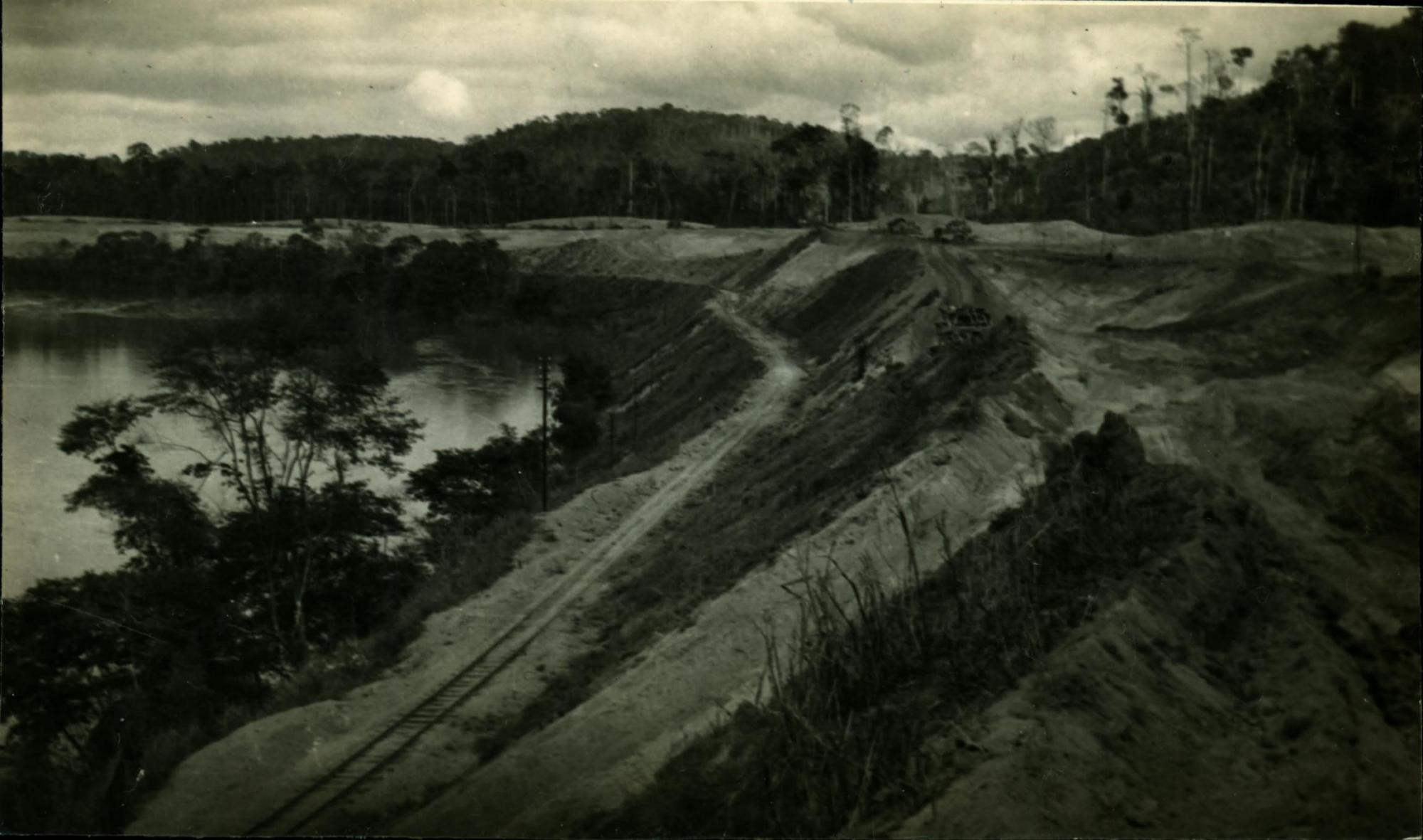 | Notas: | ANOTAES: "AUGUST 23, 1949 - NACQUE SECTION. - LOOKING WEST FROM K-435. NOTE OLD LINE BELOW, UNDER RIVER ATTACK NEAR CENTRE. NEW LINE CONSTRUCTION ABOVE. TRAFFIC MAINTAINDED ON OLD LINE THROUGHOUT CONSTRUCTION"