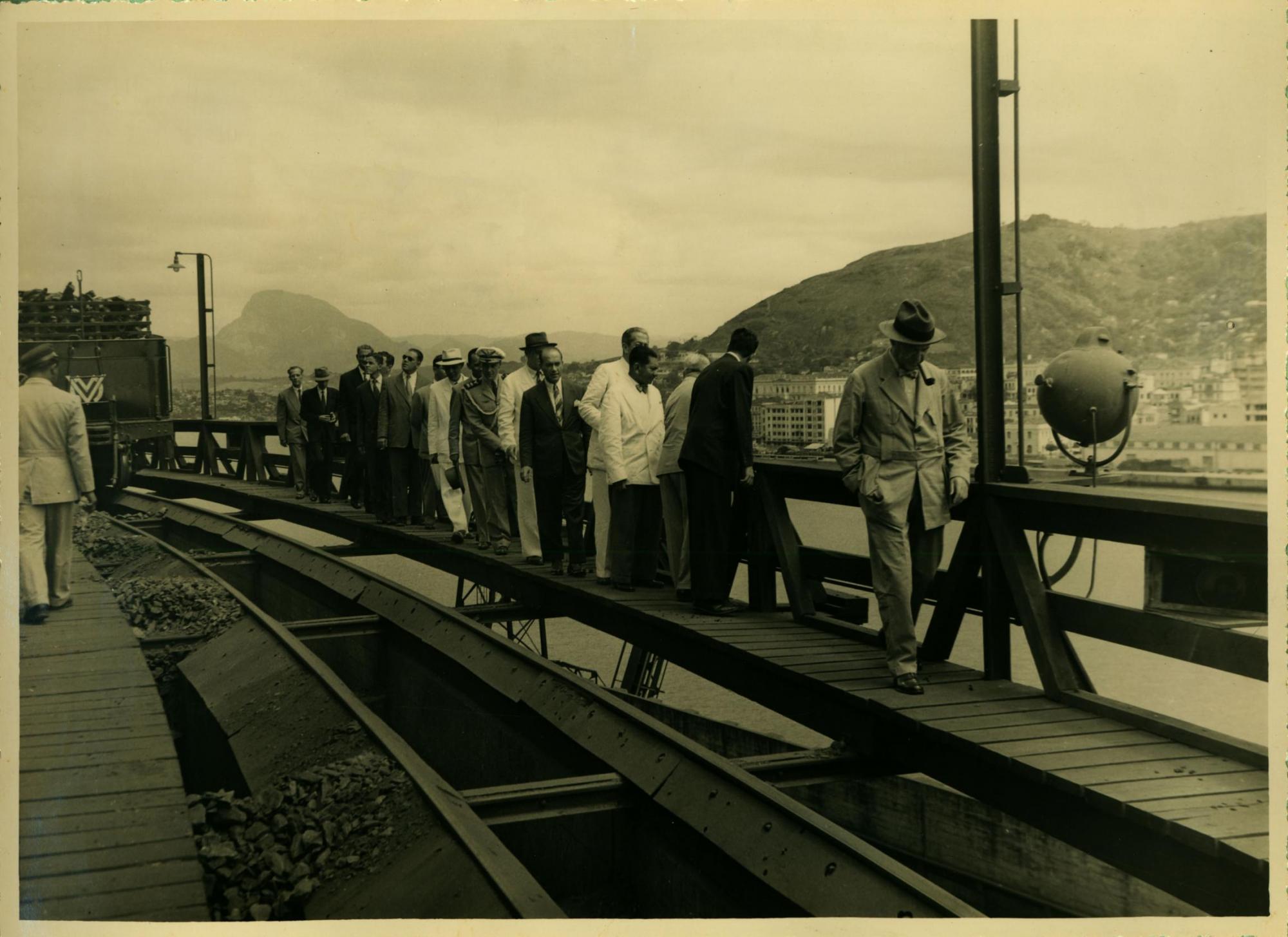 | Descrio:: | O DEPUTADO ISRAEL PINHEIRO, QUINTO DA FILA, O REPRESENTANTE DO PRESIDENTE DA REPBLICA, TENENTE CORONEL GABRIEL GRN MOSS, OITAVO, E DERMEVAL JOS PIMENTA, NONO EM VISITA AO CAIS DE MINRIO NO PORTO DE VITRIA. |