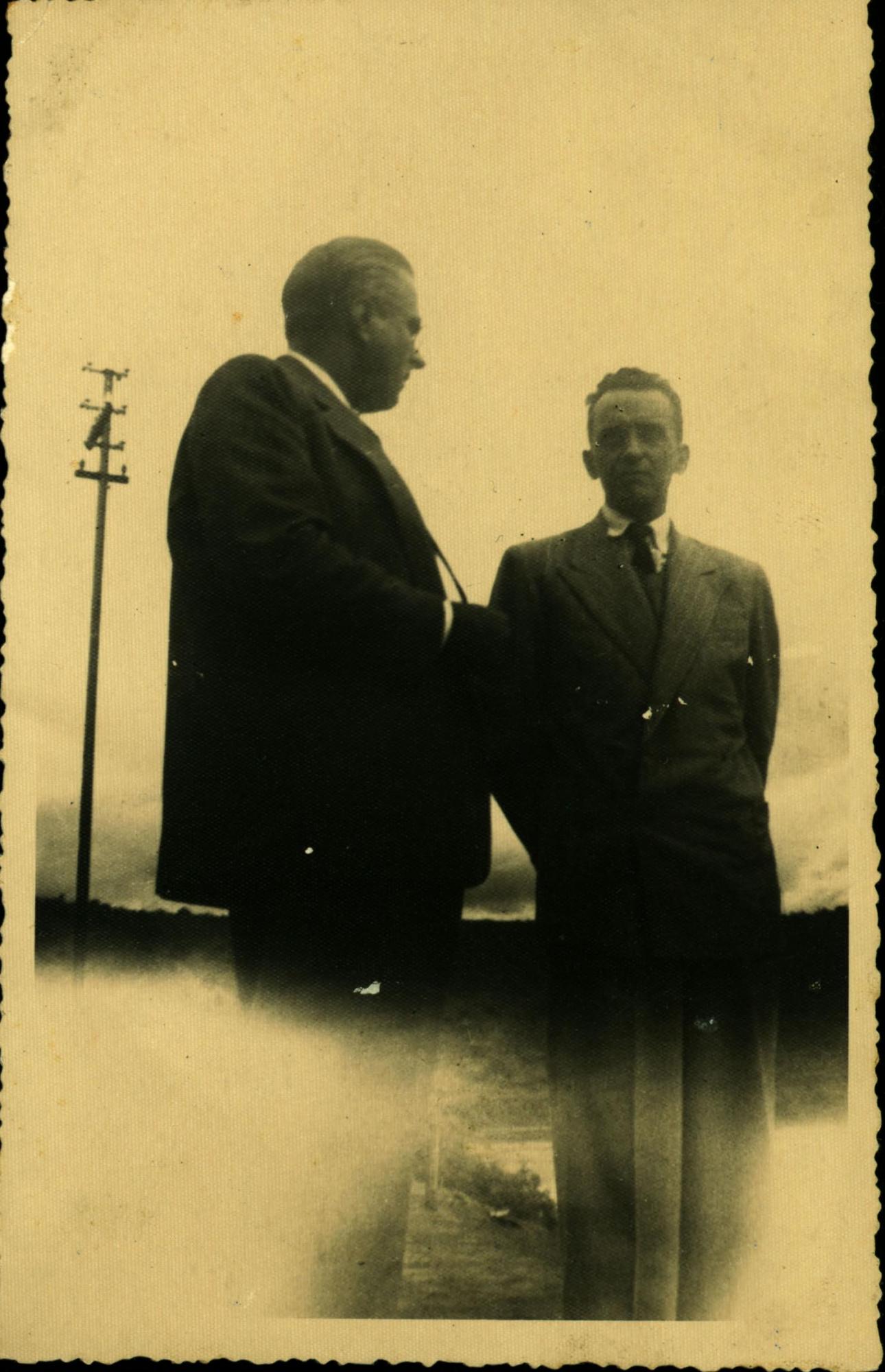 "C.V.R.D. - 1948 - MAIO - DERMEVAL, PRESIDENTE DA C.V.R.D. E O PREFEITO MUNICIPAL DE COLATINA, ESPIRITO SANTO" (VERSO)