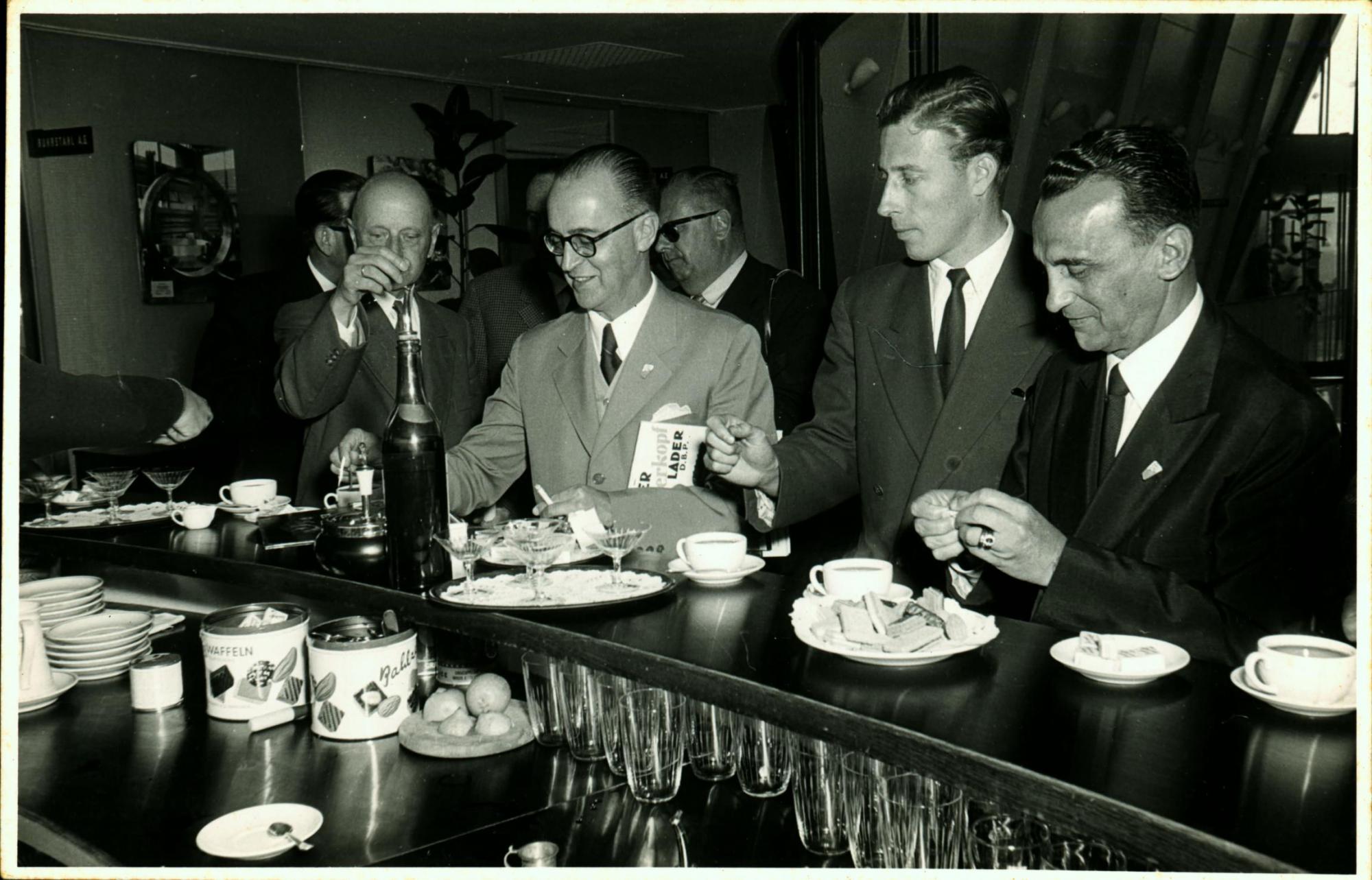 | Descrio:: | VISITA DA DELEGAO BRASILEIRA HANOMAG, EM HANNOVER: DERMEVAL JOS PIMENTA, DIREITA, E JOO KUBITSCHEK DE FIGUEIREDO, ESQUERDA, DE CULOS E TERNO CLARO; AO FUNDO, HEBHERARD BACKMAM, DE CULOS ESCUROS EM UM CAF. |