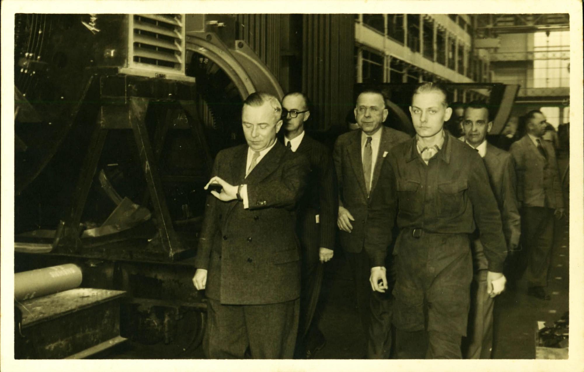 DELEGAO BRASILEIRA DURANTE VISITA SIEMENS, EM BERLIM: EM PRIMEIRO PLANO, KRUGMAN, O DIRETOR DA FEIRA DE HANNOVER; EM SEGUNDO PLANO, JOO KUBITSCHEK DE FIGUEIREDO, ESQUERDA; FRITZ REPPCHEN, AO CENTRO, E DERMEVAL JOS PIMENTA, DIREITA.