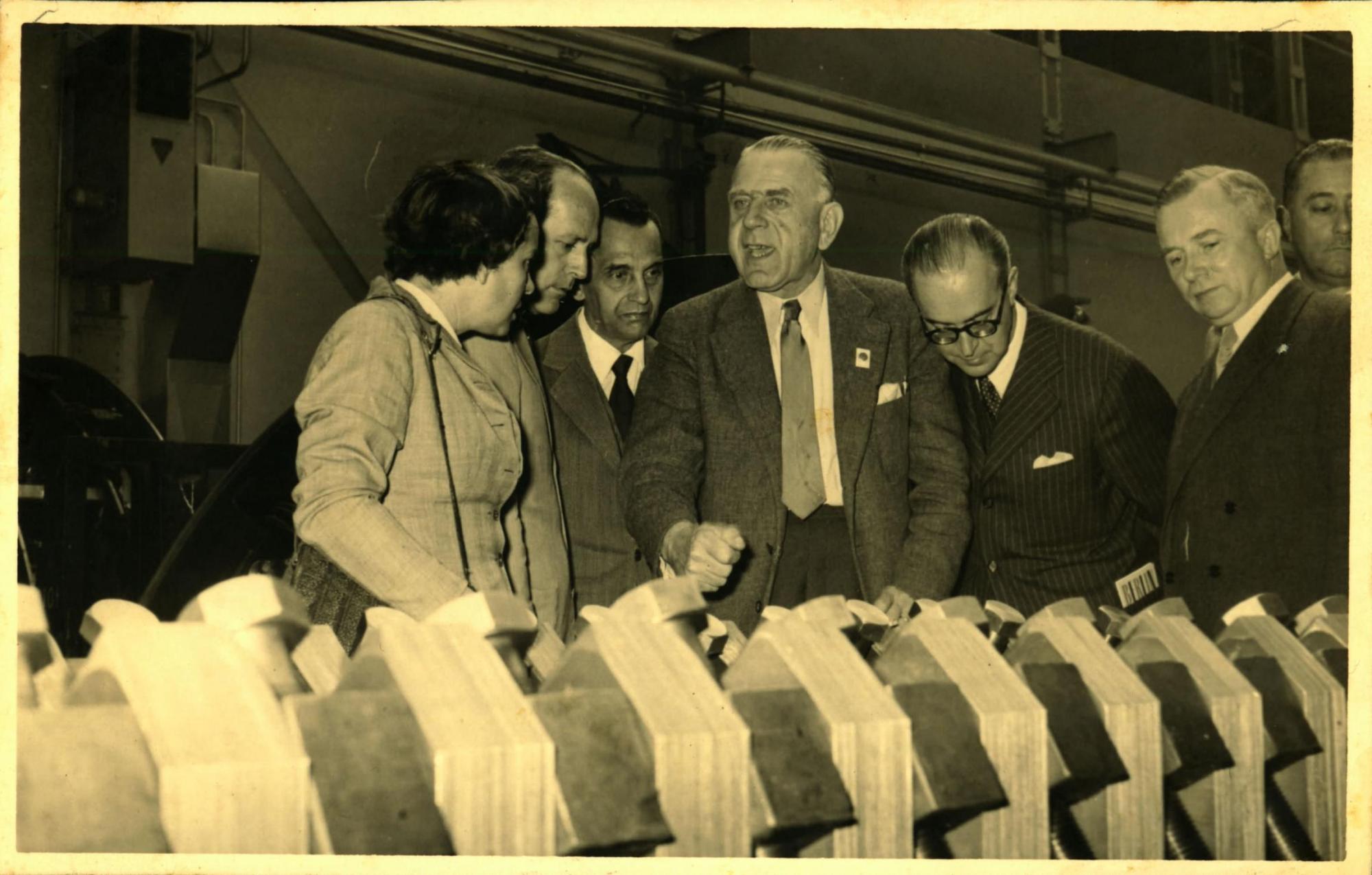 DELEGAO BRASILEIRA DURANTE VISITA SIEMENS, EM BERLIM: DA ESQUERDA PARA A DIREITA, PAULO MACEDO GONTIJO, SEGUNDO; DERMEVAL JOS PIMENTA, FRITZ REPPCHEN, JOO KUBITSCHEK DE FIGUEIREDO, KRUGMAN, O DIRETOR DA FEIRA DE HANNOVER, E LDIO LUNARDI.