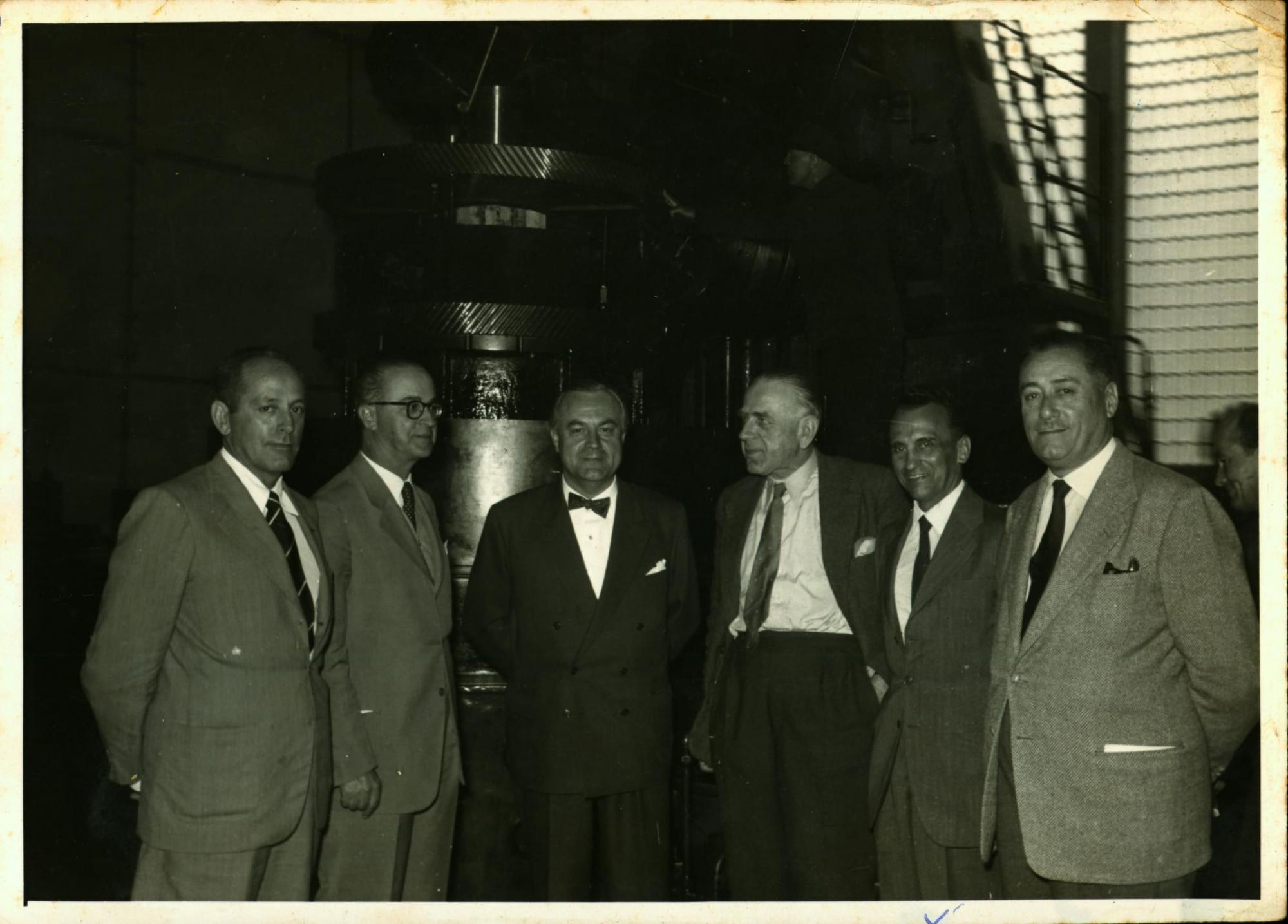 DELEGAO BRASILEIRA EM VISITA USINA DEMAG, EM DUISBURG: DA ESQUERDA PARA A DIREITA, PAULO MACEDO GONTIJO, PRIMEIRO, JOO KUBITSCHEK DE FIGUEIREDO, SEGUNDO, FRITZ REPPCHEN, QUARTO, DERMEVAL JOS PIMENTA, QUINTO, E LDIO LUNARDI, SEXTO.