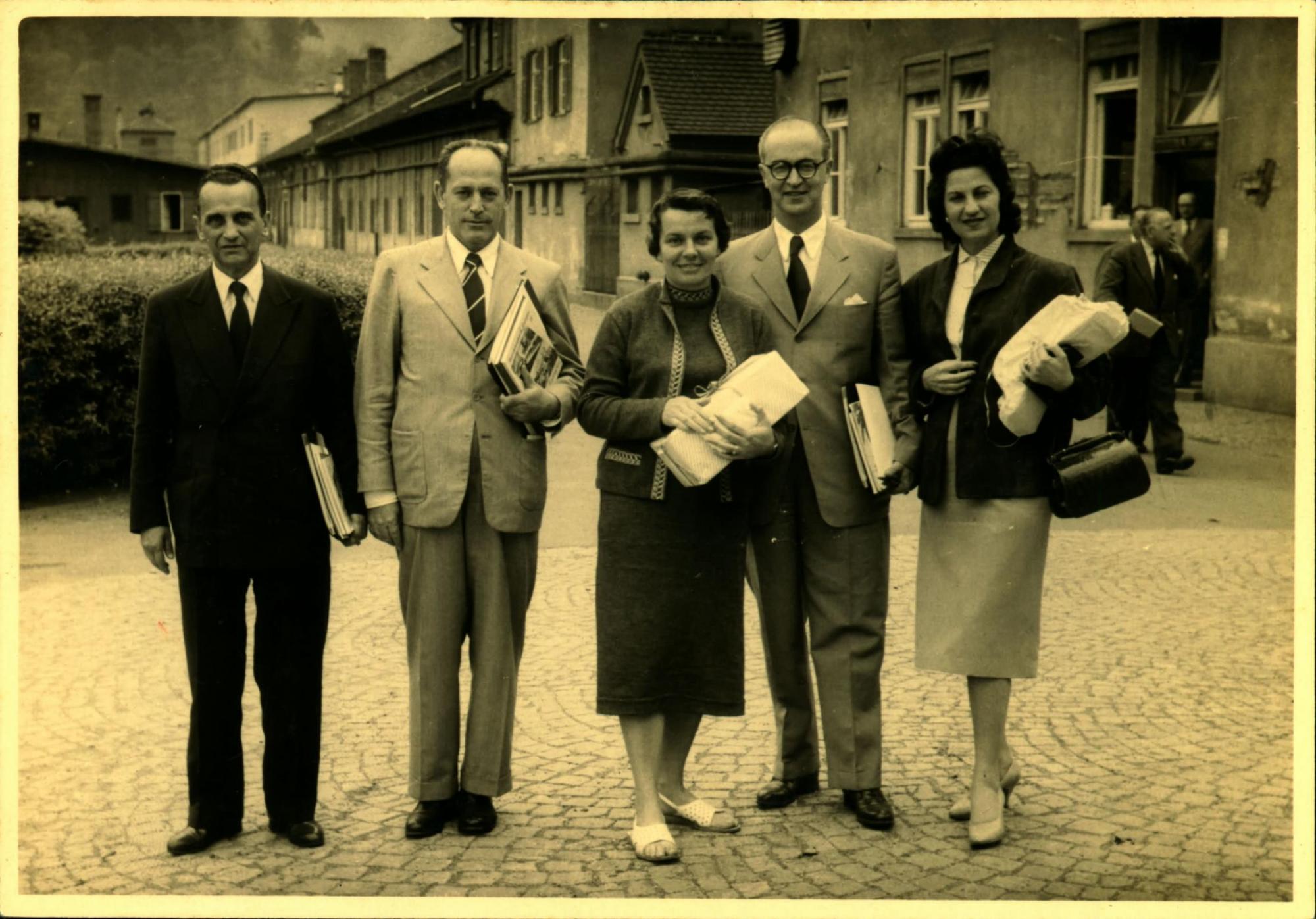 DELEGAO BRASILEIRA EM VISITA A UMA FBRICA DE LOCOMOTIVAS: DA ESQUERDA PARA A DIREITA, DERMEVAL JOS PIMENTA, PRIMEIRO, PAULO MACEDO GONTIJO, SEGUNDO, E JOO KUBITSCHEK DE FIGUEIREDO NA COMPANHIA DE DUAS MULHERES NO IDENTIFICADAS.