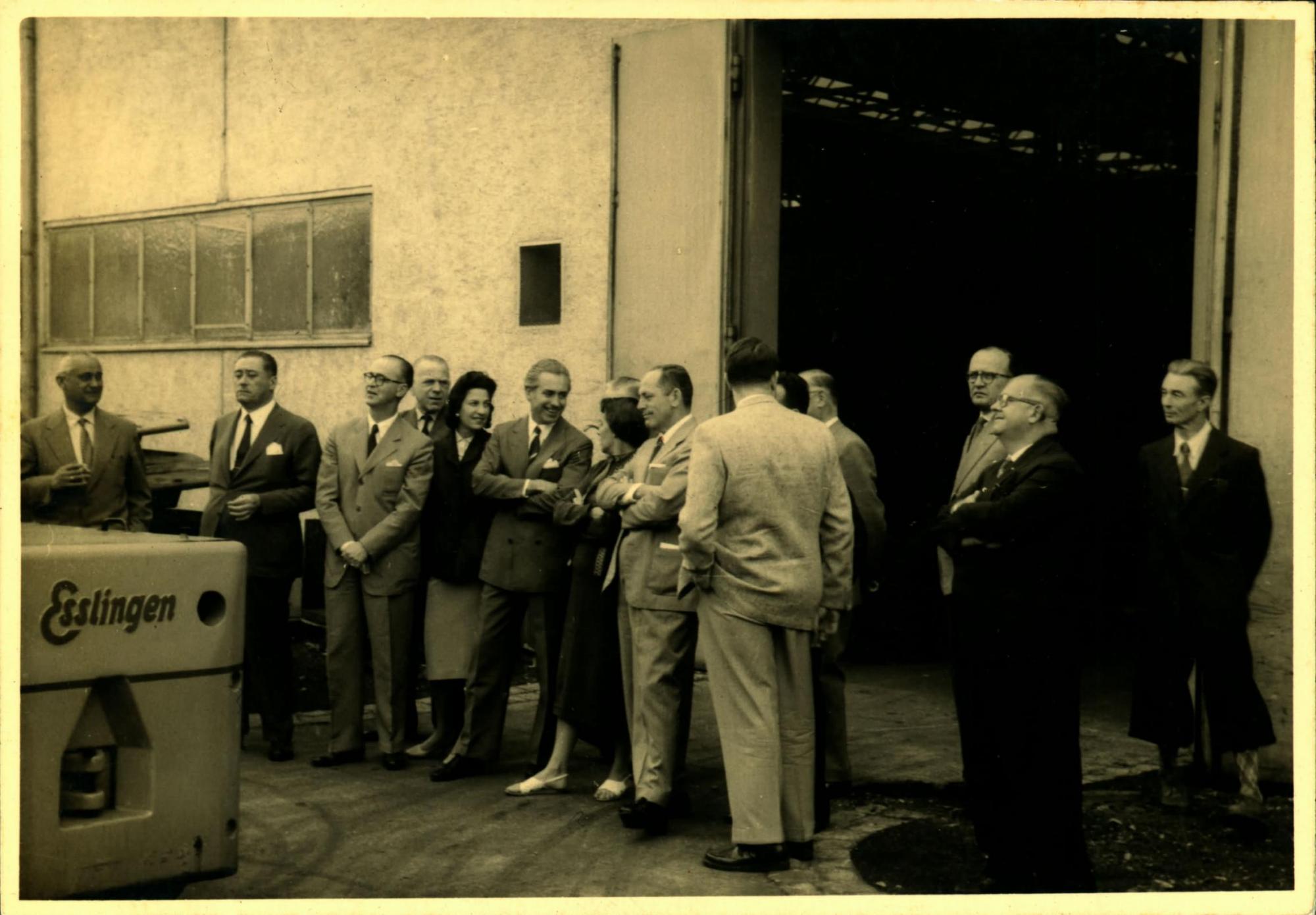 DELEGAO BRASILEIRA EM VISITA A UMA FBRICA DE LOCOMOTIVAS: DA ESQUERDA PARA A DIREITA, LDIO LUNARDI, SEGUNDO, JOO KUBITSCHEK DE FIGUEIREDO, TERCEIRO, E PAULO MACEDO GONTIJO, STIMO; DIREITA, HEBHERARD BACKMAN, DE CULOS E TERNO ESCURO.