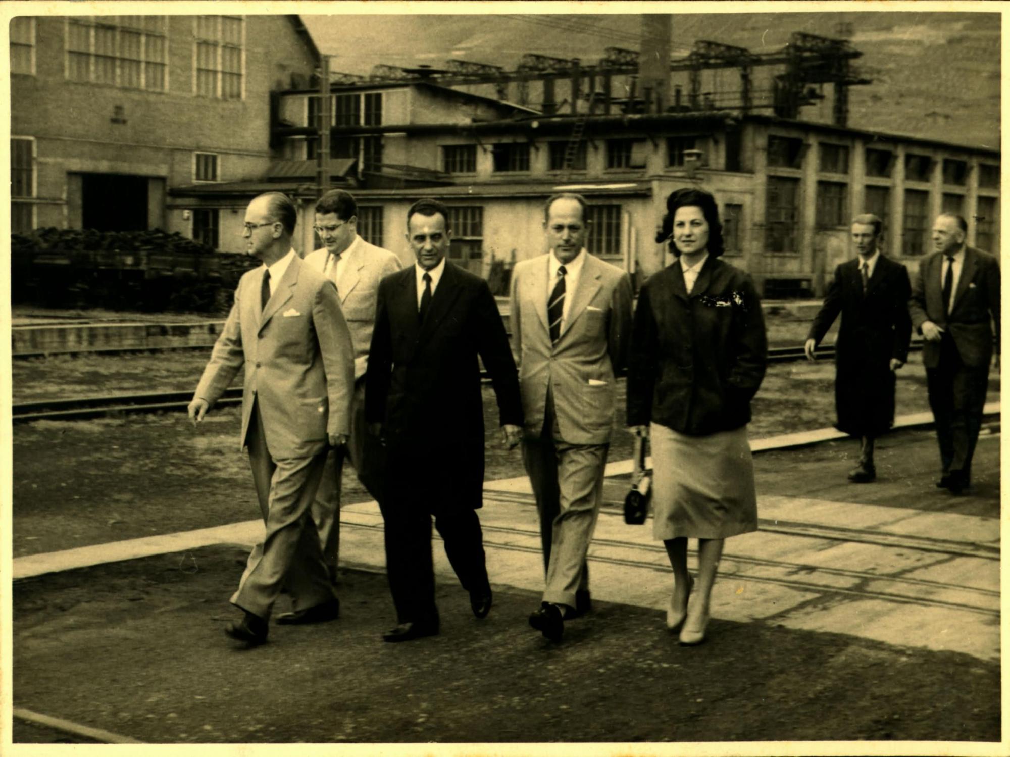 DELEGAO BRASILEIRA CAMINHANDO DURANTE VISITA A UMA FBRICA DE LOCOMOTIVAS: DA ESQUERDA PARA A DIREITA, JOO KUBITSCHEK DE FIGUEIREDO, PRIMEIRO, DERMEVAL JOS PIMENTA, SEGUNDO, E PAULO MACEDO GONTIJO, TERCEIRO, CAMINHANDO.
