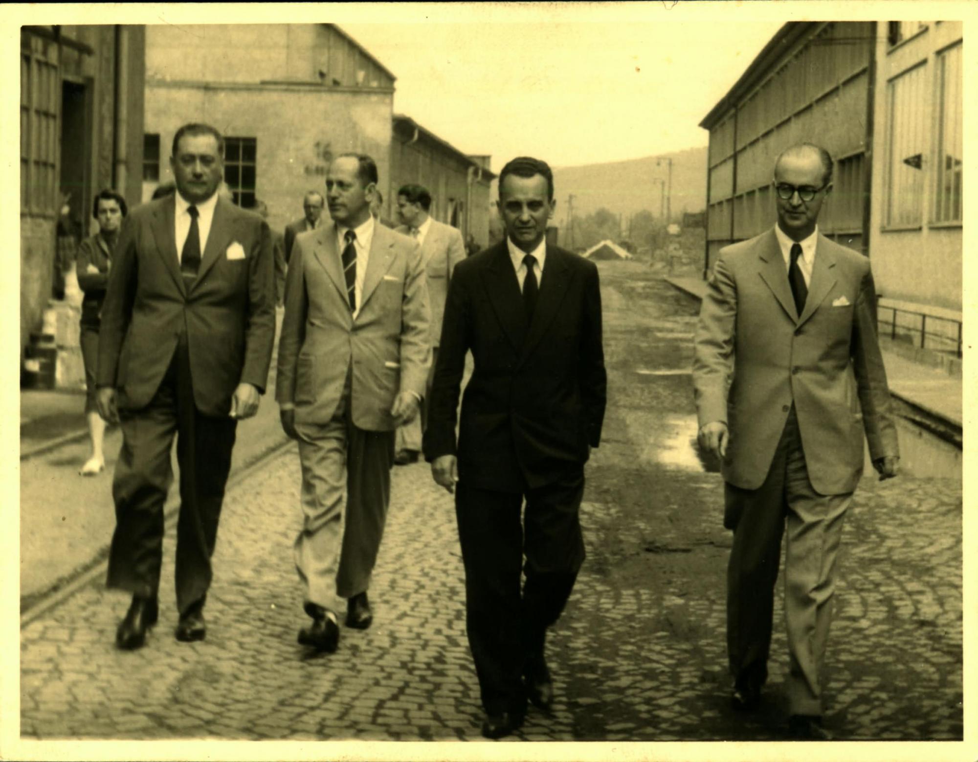 VIAGEM; DERMEVAL JOS PIMENTA; LDIO LUNARDI; PAULO MACEDO GONTIJO; JOO KUBITSCHEK DE FIGUEIREDO; EVENTO; VISITA DA DELEGAO; FBRICA DE LOCOMOTIVAS; ALEMANHA.