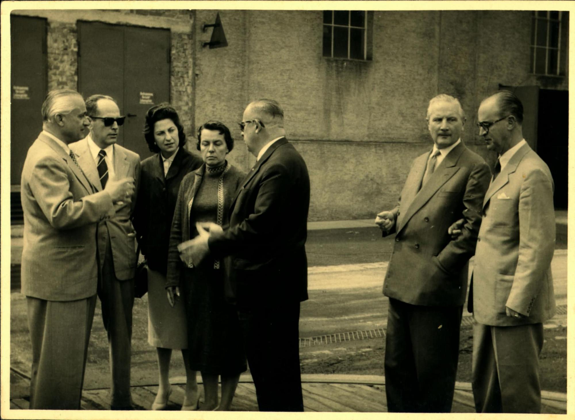 VISITA DA DELEGAO BRASILEIRA A UMA FBRICA DE LOCOMOTIVAS: ESQUERDA, PAULO MACEDO GONTIJO, DE CULOS ESCUROS, E HEBHERARD BACKMAM, DE TERNO ESCURO; DIREITA, JOO KUBITSCHEK DE FIGUEIREDO, DE TERNO CLARO E CULOS.