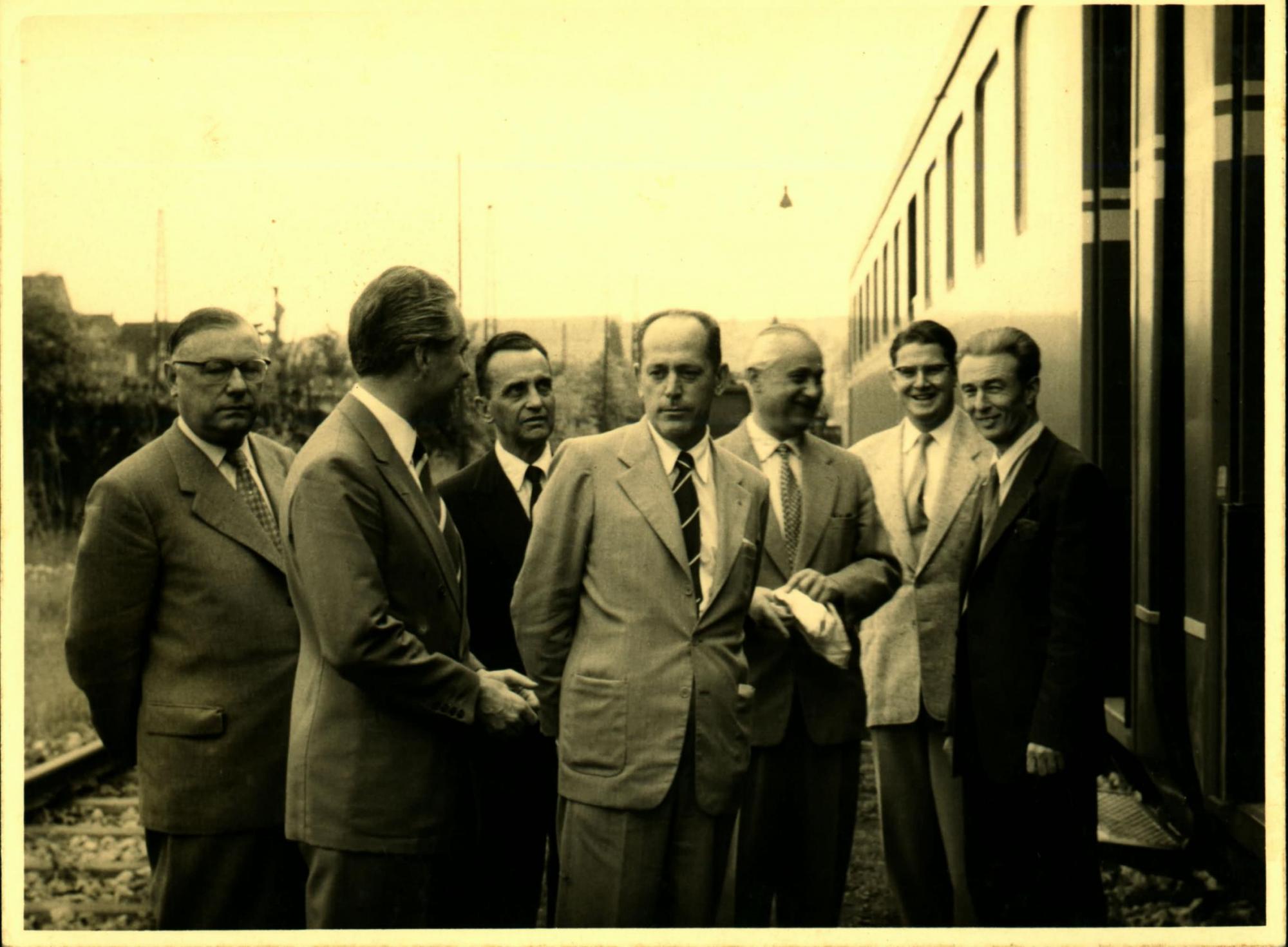 VISITA DA DELEGAO BRASILEIRA A UMA FBRICA DE LOCOMOTIVAS: AO CENTRO, PAULO MACEDO GONTIJO E, AO FUNDO, DERMEVAL JOS PIMENTA, DE TERNO ESCURO PRXIMOS A UM VAGO.