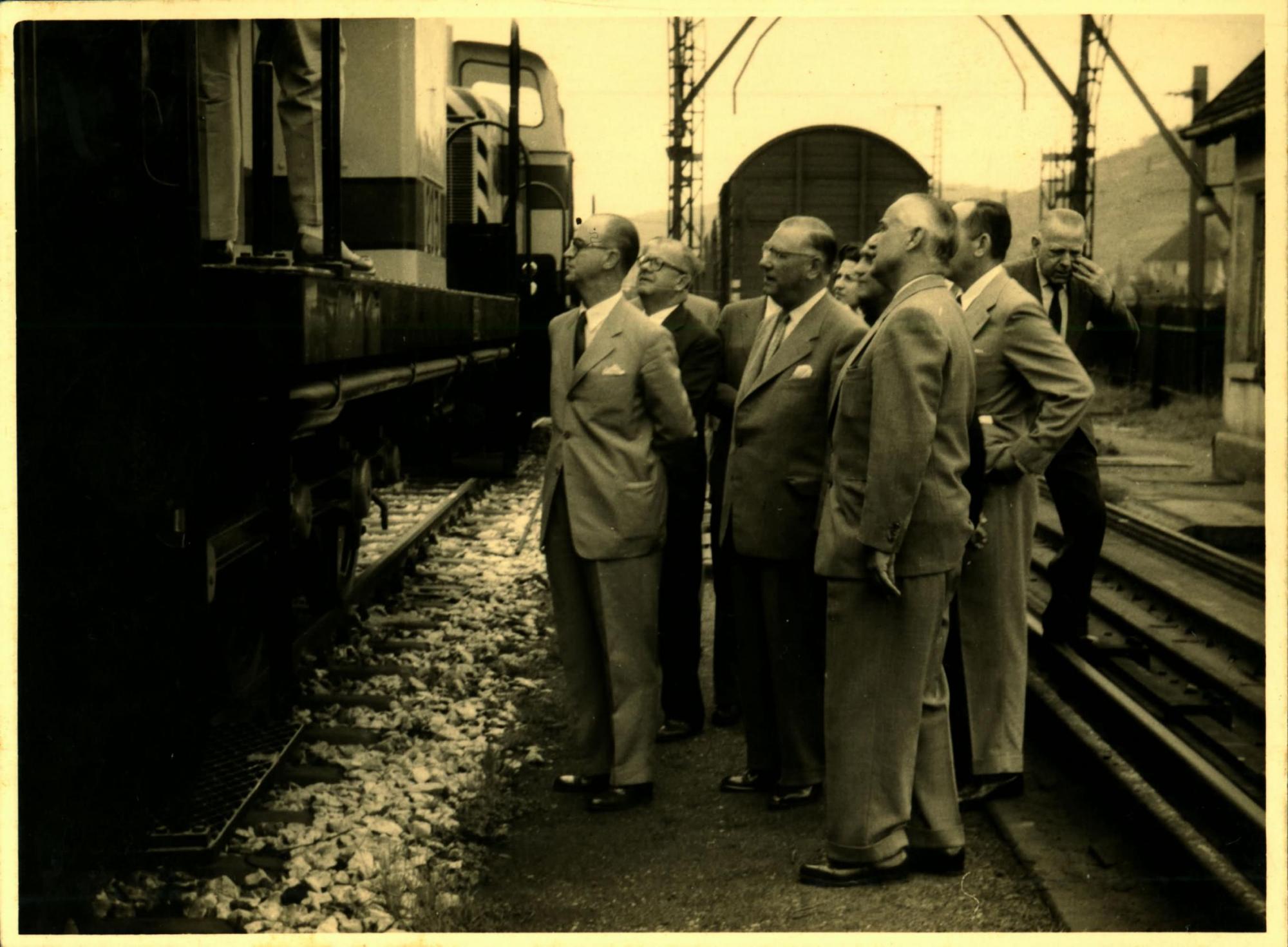VISITA DA DELEGAO BRASILEIRA A UMA FBRICA DE LOCOMOTIVAS: ESQUERDA, JOO KUBITSCHEK DE FIGUEIREDO; AO FUNDO, HEBHERARD BACKMAM, DE TERNO ESCURO, E FRITZ REPPCHEN, SOBRE OS TRILHOS OBSERVANDO UMA LOCOMOTIVA.