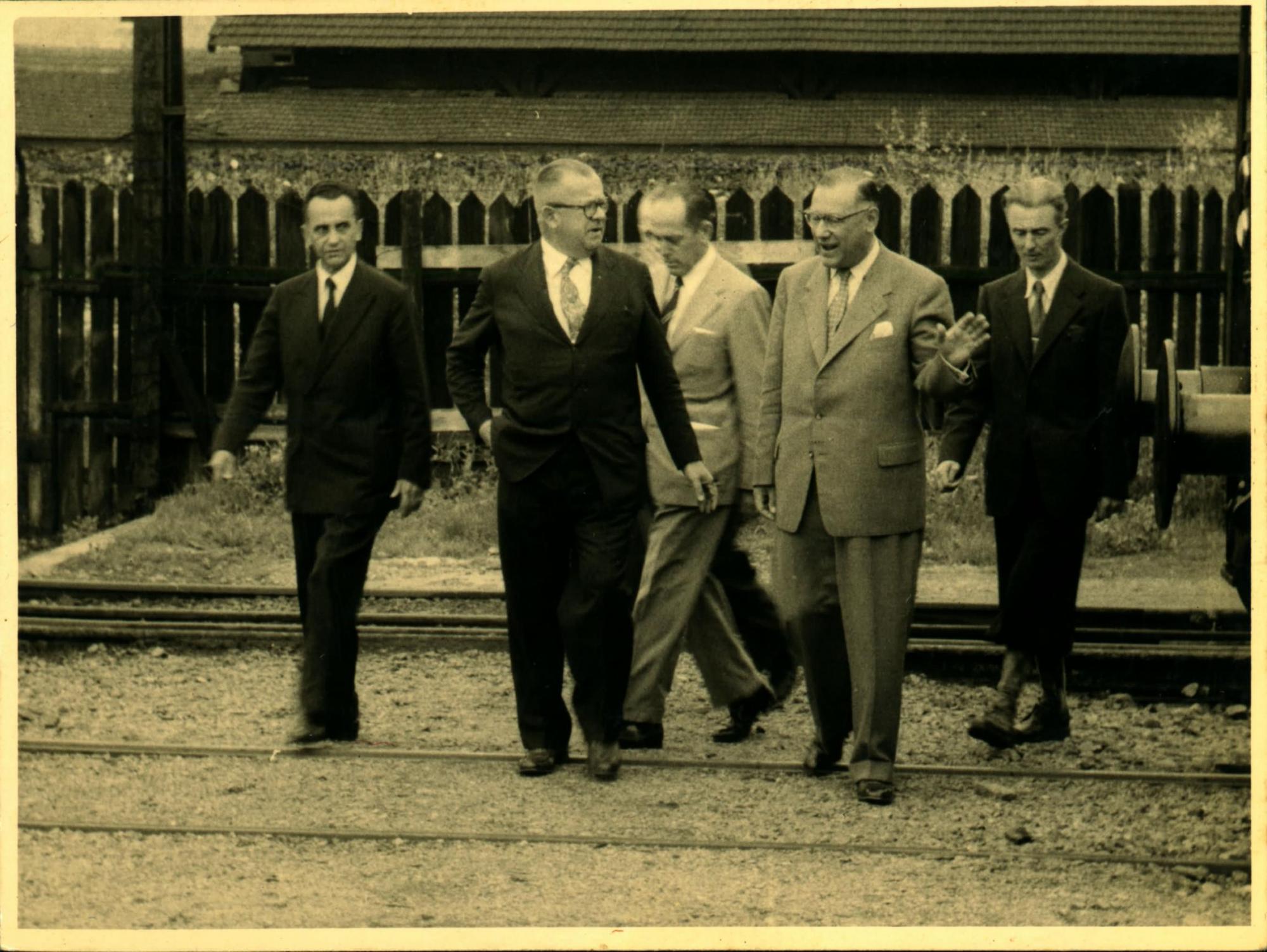 VISITA DA DELEGAO BRASILEIRA A UMA FBRICA DE LOCOMOTIVAS: DA ESQUERDA PARA A DIREITA, DERMEVAL JOS PIMENTA, HEBHERARD BACKMAM, AMBOS DE TERNO ESCURO, E PAULO MACEDO GONTIJO, AO CENTRO, EM SEGUNDO PLANO.