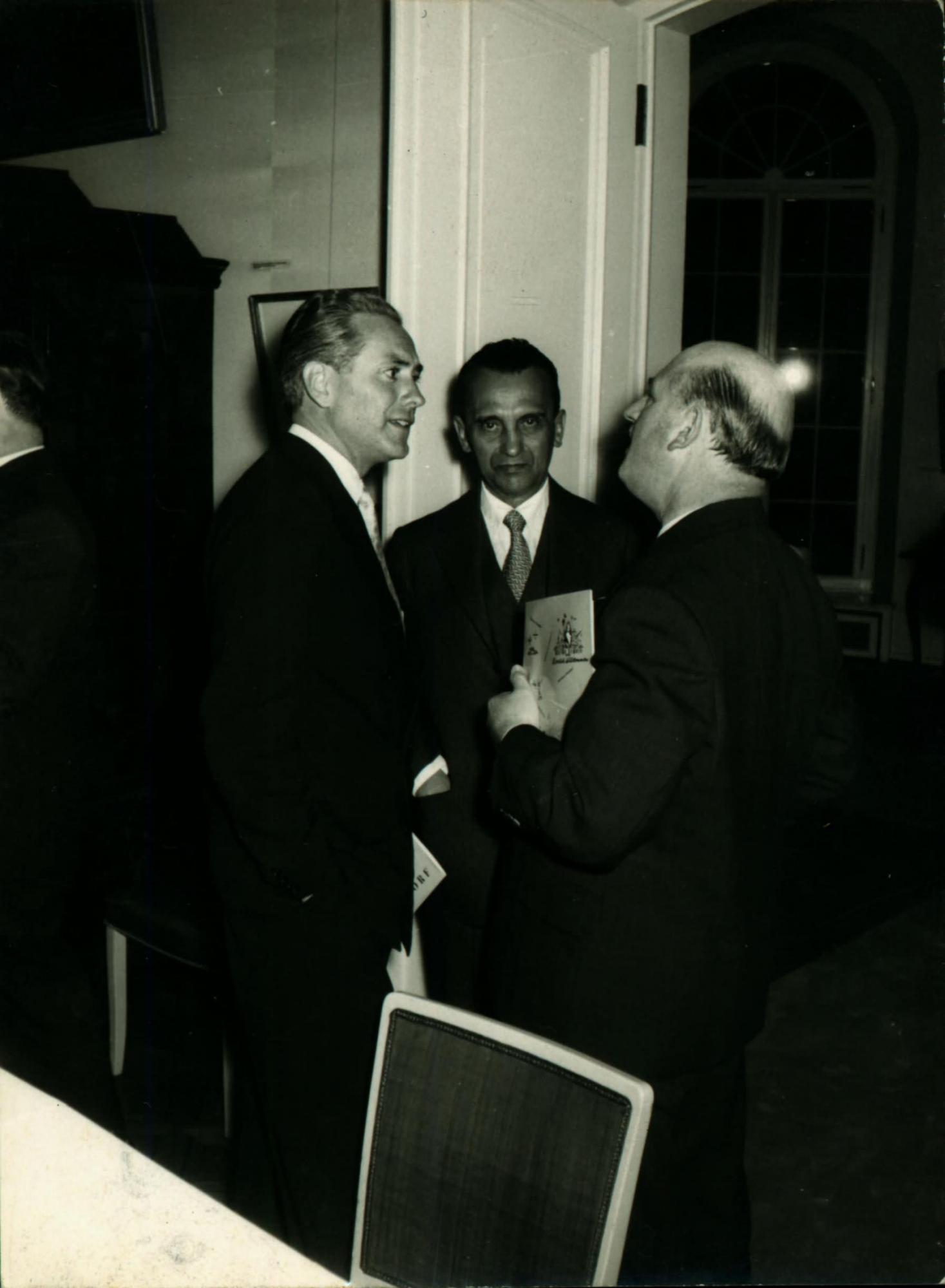 | Descrio:: | DERMEVAL JOS PIMENTA, AO CENTRO, ACOMPANHADO DE DOIS HOMENS NO IDENTIFICADO DURANTE RECEPO NA CASA DE HERBERT COOPER, GERENTE DA PANAIR DO BRASIL, EM DSSELDORF. |