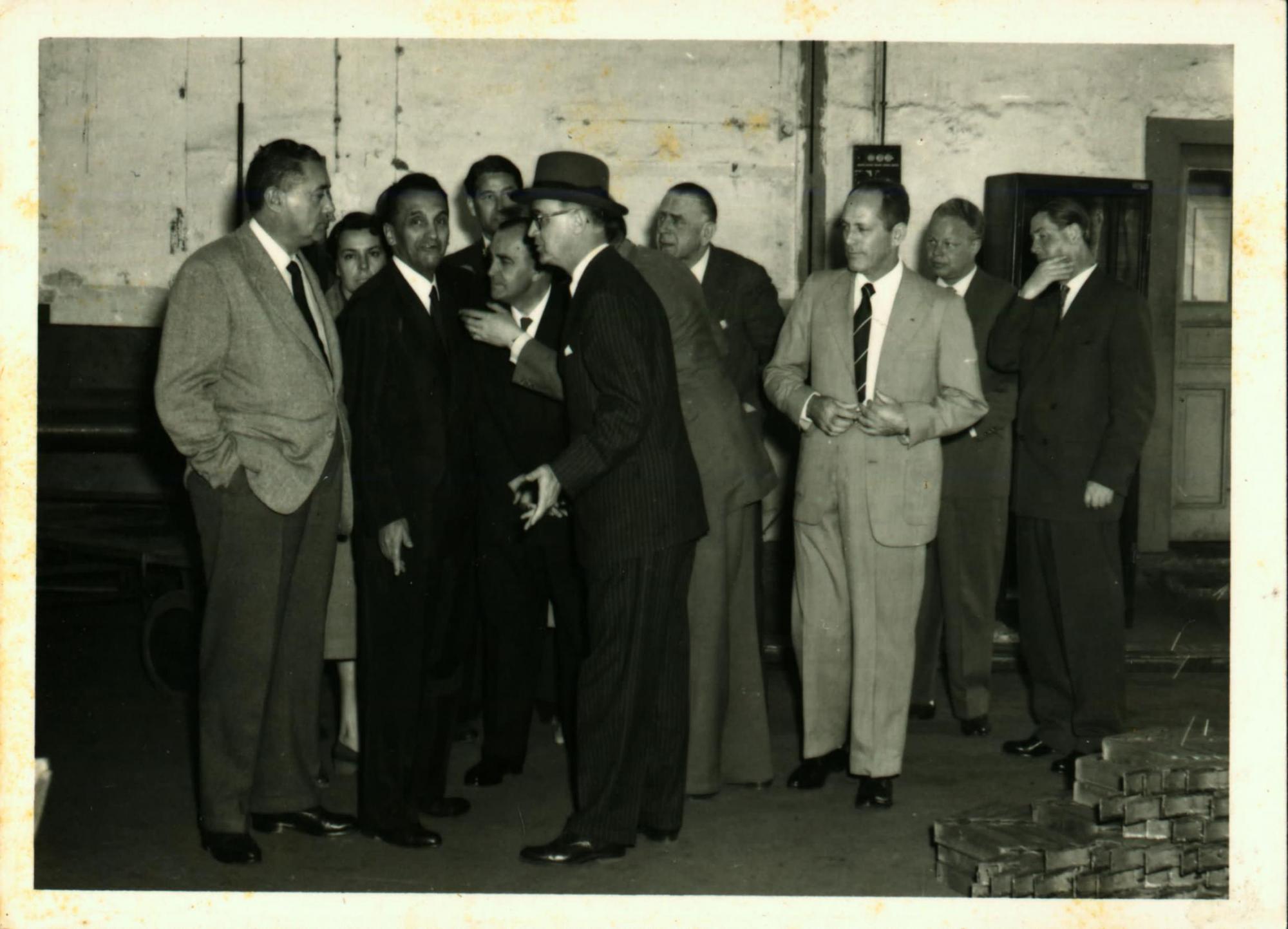 | Descrio:: | VISITA DA DELEGAO BRASILEIRA FBRICA DA ZETTELMEYER, EM TRIER: DA ESQUERDA PARA A DIREITA, LDIO LUNARDI, DERMEVAL JOS PIMENTA, JOO KUBITSCHEK DE FIGUEIREDO, DE CHAPU, PAULO MACEDO GONTIJO, DIREITA, DE TERNO CLARO. |