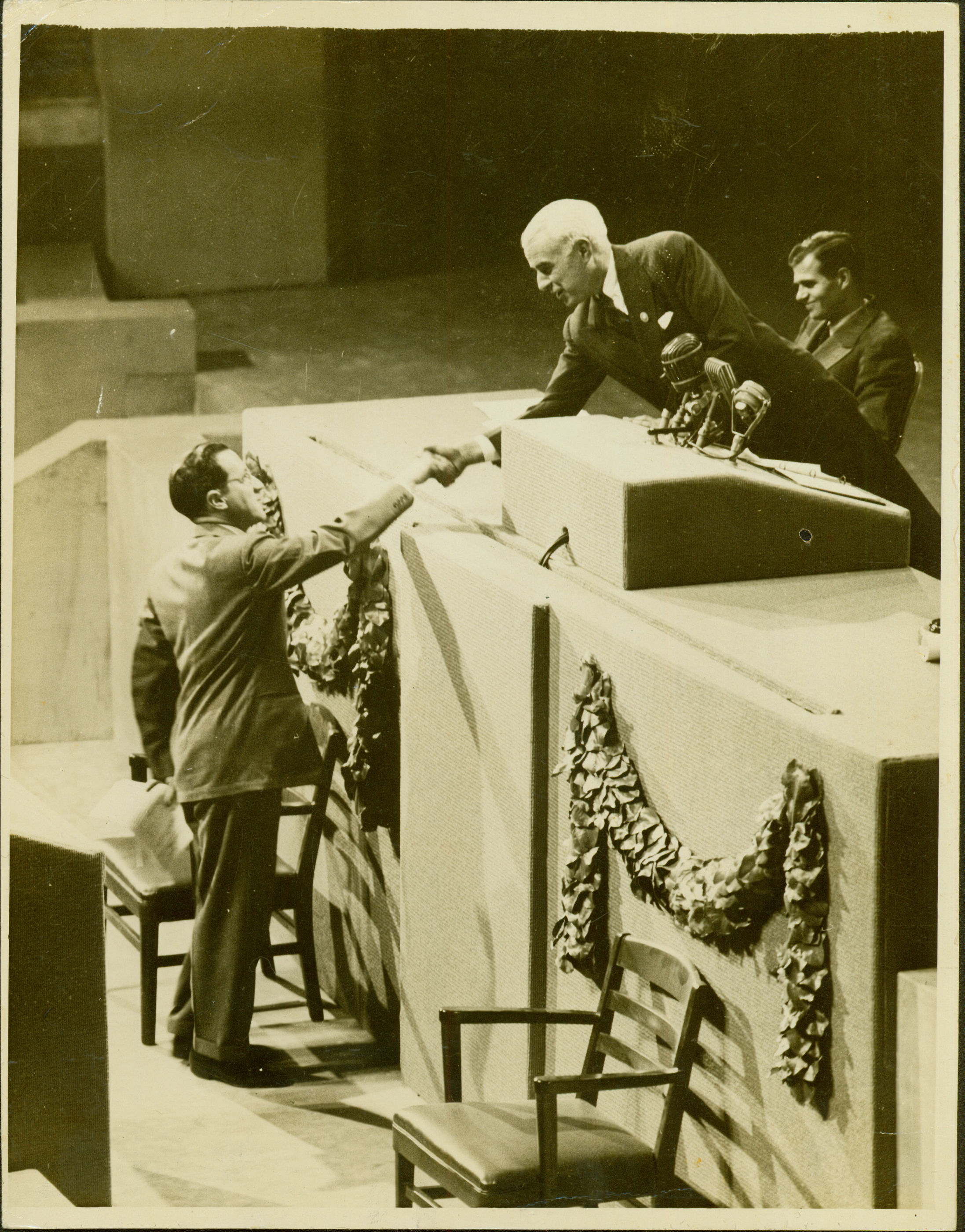 | Notas: | => GUILLERNIA BELT, DELEGADO CUBANO ENQUANTO ERA CUMPRIMENTADO NO PALANQUE DOS ORADORES PELO SECRETRIO DE ESTADO AMERICANO EDWARD STETTINIUS. O DOUTOR BELT PROFERIU SEU DISCURSO AOS DELEGADOS NA 3 SEO DO PLENRIO DA CONFERNCIA SOBRE ORGANIZAO INTER |