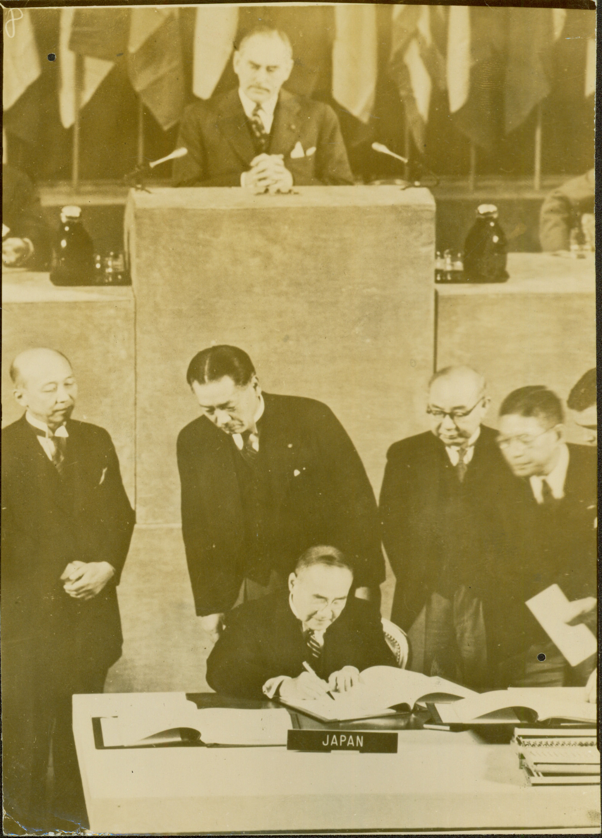 | Notas: | => SHIGERU YOSHIDA, PRIMEIRO MINISTRO DO JAPO - ASSINATURA EM CARACTERES JAPONESES, AO P NO TRATADO DE PAZ QUE POS FIM AO ESTADO DE GUERRA ENTRE SUA PTRIA E AS 48 NAES ALIADAS. SUA DELEGAO FOI A LTIMA A A ASSINAR O HISTRICO DOCUMENTO NO ENCERRAME |