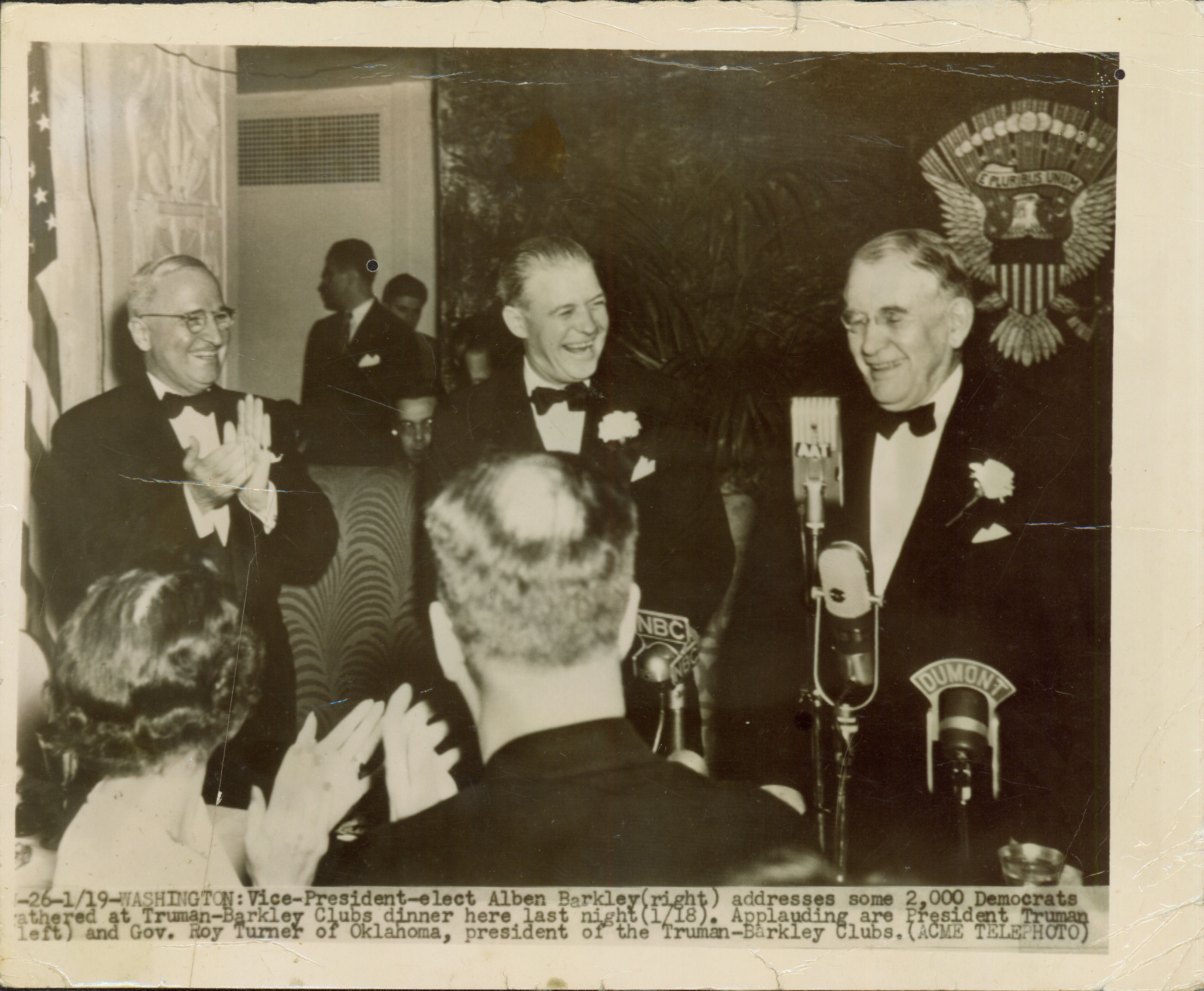 | Notas: | => O VICE-PRESIDENTE ALBEN BARKLEY (DIREITA) DIRIGE-SE A ALGUNS DEMOCRATAS REUNIDOS EM UM JANTAR NA ASSOCIAO TRUMAN-BARKLEY. APLAUDINDO ESTO, O PRESIDENTE TRUMAN (ESQUERDA) E O GOVERNADOR ROY TURNER (CENTRO) DE OKLAHOMA, PRESIDENTE DA ASSOCIAO. |