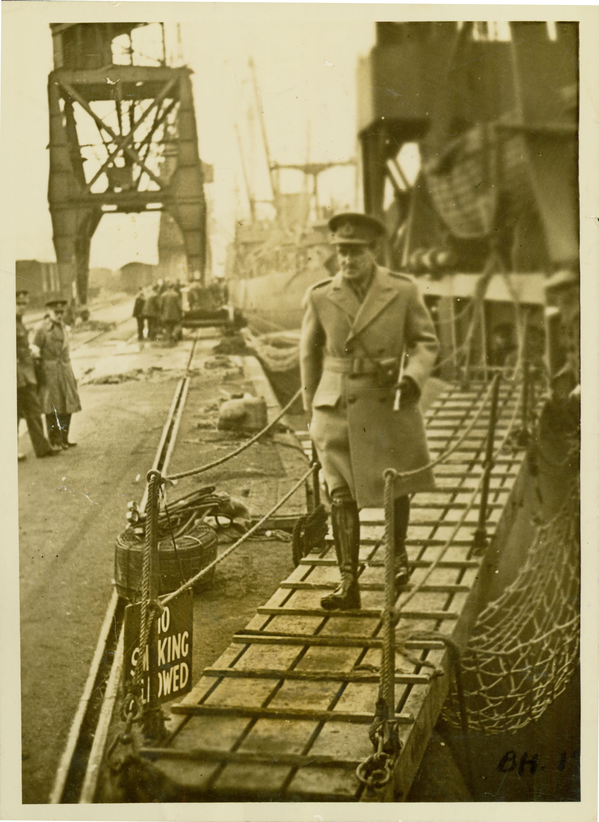 | Notas: | => O COMANDANTE EM CHEFE DAS FORAS TERRESTRES, GENERAL SIR GERARD PAGET, CAMINHANDO POR UMA PRANCHA DE DESEMBARQUE DE UM NAVIO DE ABASTECIMENTO, QUANDO ESTE ESTAVA ANCORADO EM UM PORTO. RECORTE DE JORNAL. |
