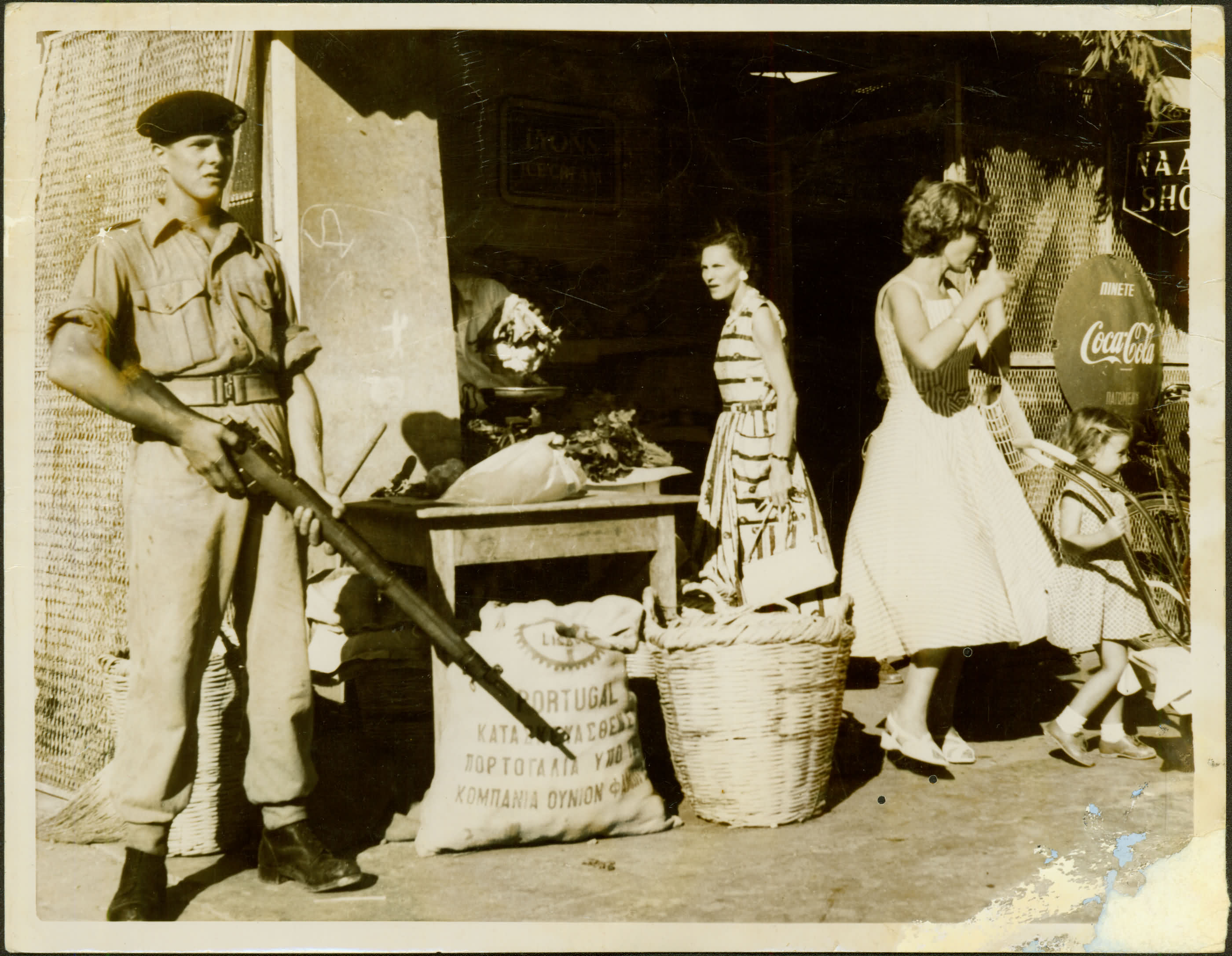 [SOLDADO GUARDA UM MERCADO ENQUANTO MULHERES FAZEM COMPRAS]