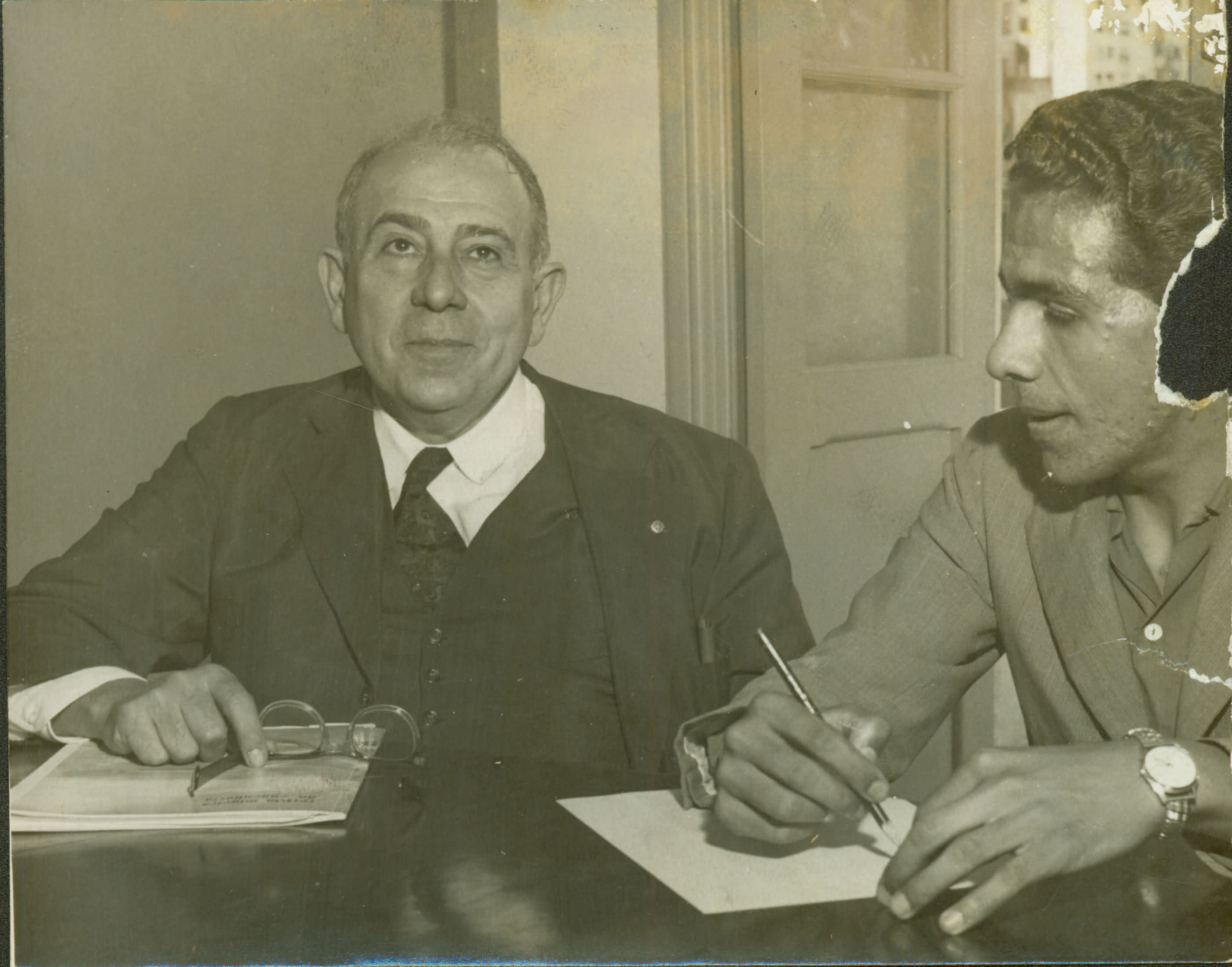 | Notas: | ANOTAES: O SR. JOS ERMNIO DE MORAIS QUANDO ERA ENTREVISTADO NA SOCIEDADE MINEIRA DE ENGENHARIA. (VERSO) =>FOTO DANIFICADA. |