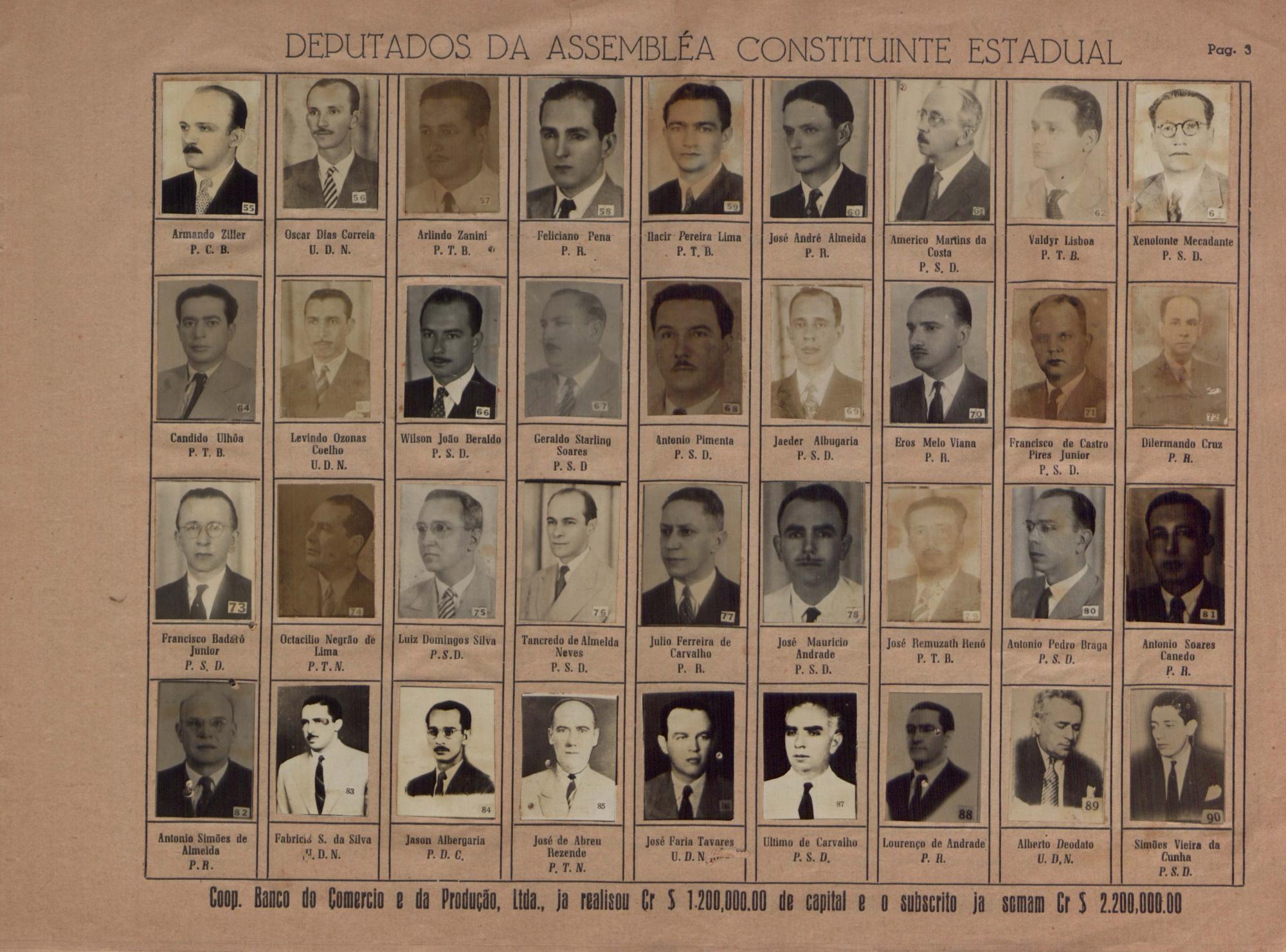 =>PESSOAS IDENTIFICADAS 55 -DEPUTADO (PCB): ARMANDO ZILLAR 56 -DEPUTADO (UDN): OSCAR DIAS CORREIRA 57 -DEPUTADO (PTB): ARLINDO ZANINI 58 -DEPUTADO (PR): FELICIANO PENA 59 -DEPUTADO (PTB): ILACIR PEREIRA LIMA 60 -DEPUTADO (PR): JOS ANDR ALMEIDA 61 -DEPUTADO (PSD): AMRICO MARTINS DA COSTA 62 -DEPUTADO (PTB): VALDYR LISBOA 63 -DEPUTADO (PSD): XENOFONTE MECADANTE 64 -DEPUTADO (PTB): CANDIDO ULHOA 65 -DEPUTADO (UDN): LEVINDO OZANAS COELHO 66 -DEPUTADO (PSD): WILSON JOO GERALDO 67 -DEPUTADO (PSD): GERALDO STARLING SOARES 68 -DEPUTADO (PSD): ANTNIO PIMENTA 69 -DEPUTADO (PSD): JAEDER ALBUGARIA 70 -DEPUTADO (PR): EROS MELO VIANA 71 -DEPUTADO (PSD): FRANCISCO DE CASTRO PIRES JUNIOR 72 -DEPUTADO (PR): DILERMANDO CRUZ 73 -DEPUTADO (PSD): FRANCISCO BADAR JUNIOR 74 -DEPUTADO (PTN): OTACILIO NEGRO DE LIMA 75 -DEPUTADO (PSD): LUIZ DOMINGOS SILVA 76 -DEPUTADO (PSD): TANCREDO DE ALMEIDA NEVES 77 -DEPUTADO (PR): JULIO FERREIRA CARVALHO 78 -DEPUTADO (PSD): JOS MAURICIO ANDRADE 79 -DEPUTADO (PTB): JOS REMUZATH REN 80 -DEPUTADO (PSD): ANTNIO PEDRO BRAGA 81 -DEPUTADO (PR): ANTNIO SOARES CANEDO 82 -DEPUTADO (PR): ANTNIO SIMES ALMEIDA 83 -DEPUTADO (UND): FABRICIO S DA SILVA 84 -DEPUTADO (PDC): JASON ALBERGARIA 85 -DEPUTADO (PTN): JOS DE ABREU REZENDE 86 -DEPUTADO (UDN): JOS FARIA TAVARES 87 -DEPUTADO (PSD): LTIMO DE CARVALHO 88 -DEPUTADO (PR): LOURENO DE ANDRADE 89 -DEPUTADO (UDN): ALBERTO DEODATO 90 -DEPUTADO (PSD): SIMES VIEIRA DA CUNHA" |