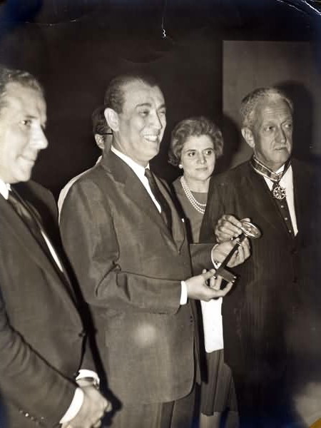 [CERIMNIA DE ENTREGA DA CHAVE DE OURO DE BRASLIA POR ISRAEL PINHEIRO A JUSCELINO KUBITSCHEK, BEM COMO DA MEDALHA DA ORDEM NACIONAL DO MRITO, NA PRESENA DE DONA CORACY PINHEIRO E JOO GOULART]