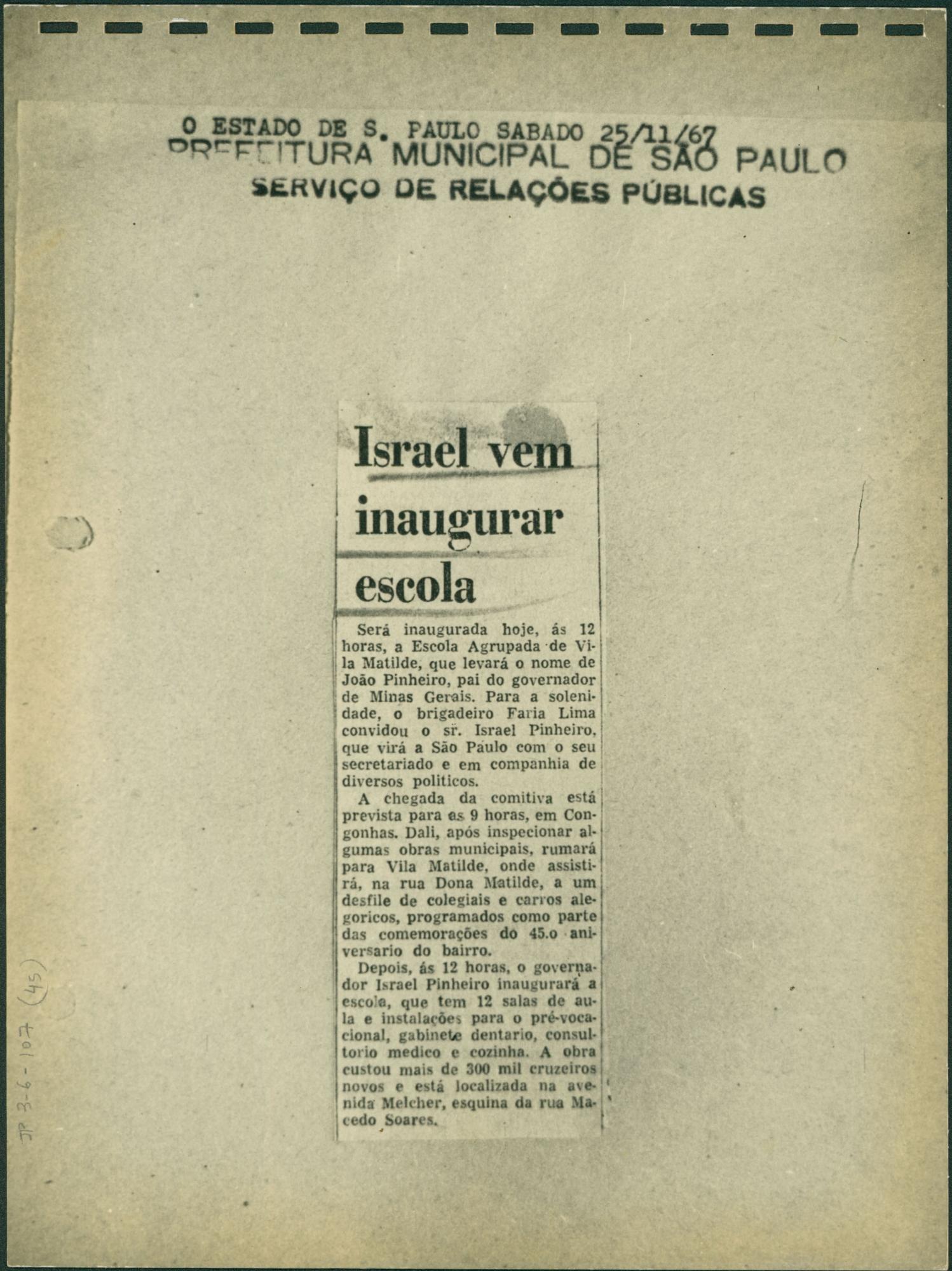 [REPRODUO DE JORNAL "O ESTADO DE SO PAULO" SOBRE A VISITA DO GOVERNADOR ISRAEL PINHEIRO A SO PAULO]