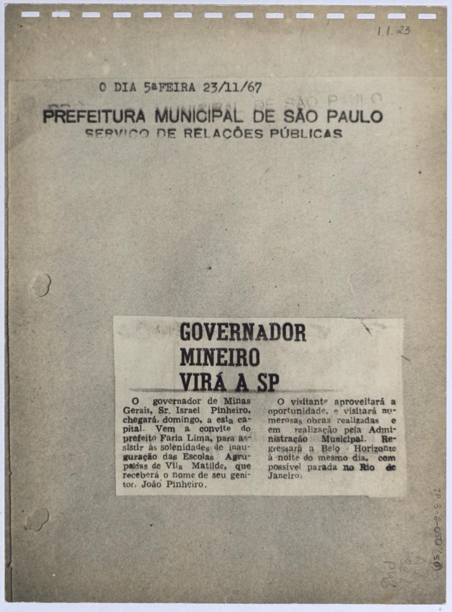 | Notas: | OUTRAS DIMENSES: "23,3 X 17,4 CM" CARIMBO: "O DIA 5 FEIRA 23/11/67 PREFEITURA MUNICIPAL DE SO PAULO SERVIO DE RELAES PBLICAS" |